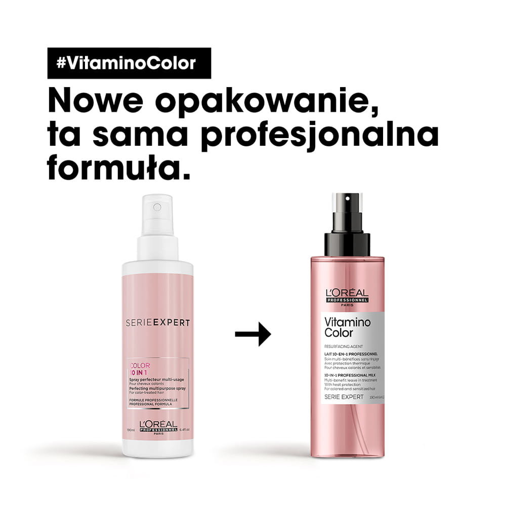 Spray wielofunkcyjny do włosów koloryzowanych Vitamino Color od marki L'Oreal Professionnel. Profesjonalna formuła z przeciwutleniaczami zapewnia natychmiastową ochronę włosów farbowanych. Gwarantuje 10 korzyści dla włosów: 1-ochrona termiczna do 230 °C, 2-połysk, 3-miękkość, 4-gładkość włókna włosa, 5-łatwiejsze rozczesywanie, 6-ułatwia suszenie, 7-nawilżenie, 8-ochrona przeciw łamaniu, 9-ochrona przeciw rozdwajaniu się końcówek, 10-ochrona przed puszeniem. Spray może być stosowany przed strzyżeniem, suszeniem włosów lub przy stylizacji fryzury.