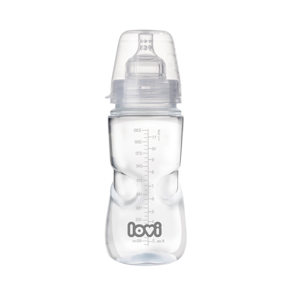 W zestawie: butelka Lovi 330 ml; dynamiczny smoczek Lovi o wolnym przepływie; elastyczny dysk uszczelniający; nakrętka; kubek do pojenia