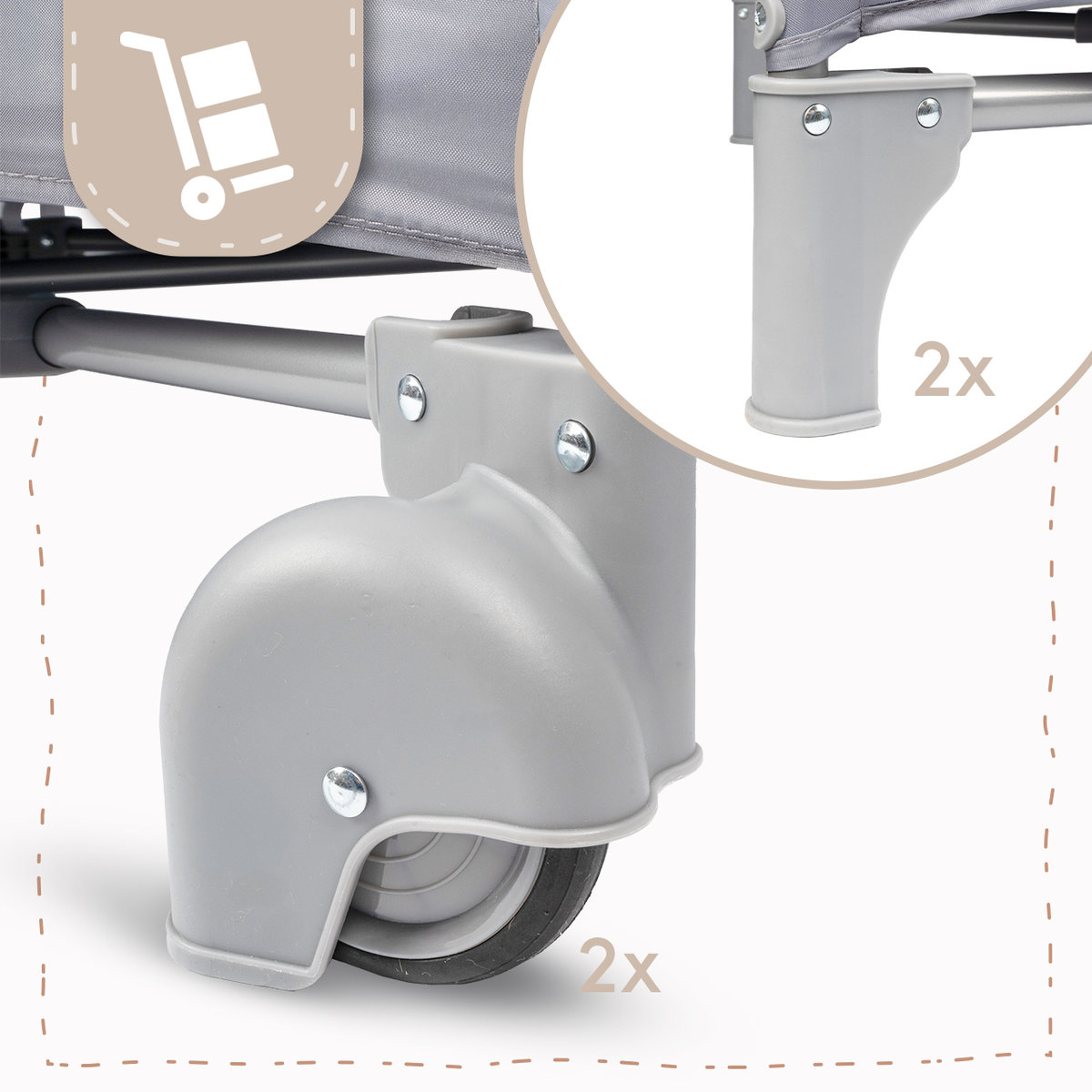 - 2 kółka transportowe, które pozwalają na łatwe przesuwanie łóżeczka po mieszkaniu lub zabraniu go na wyjazd
