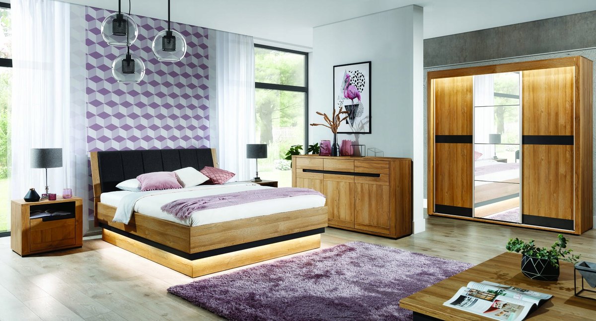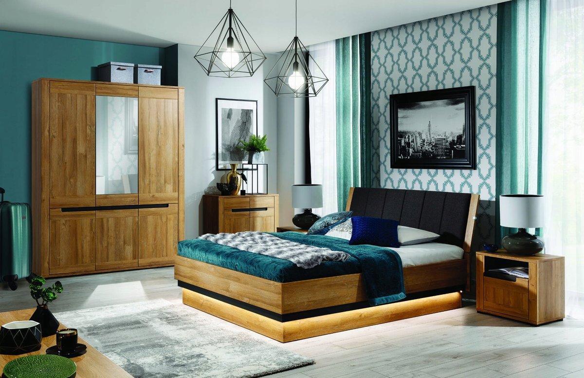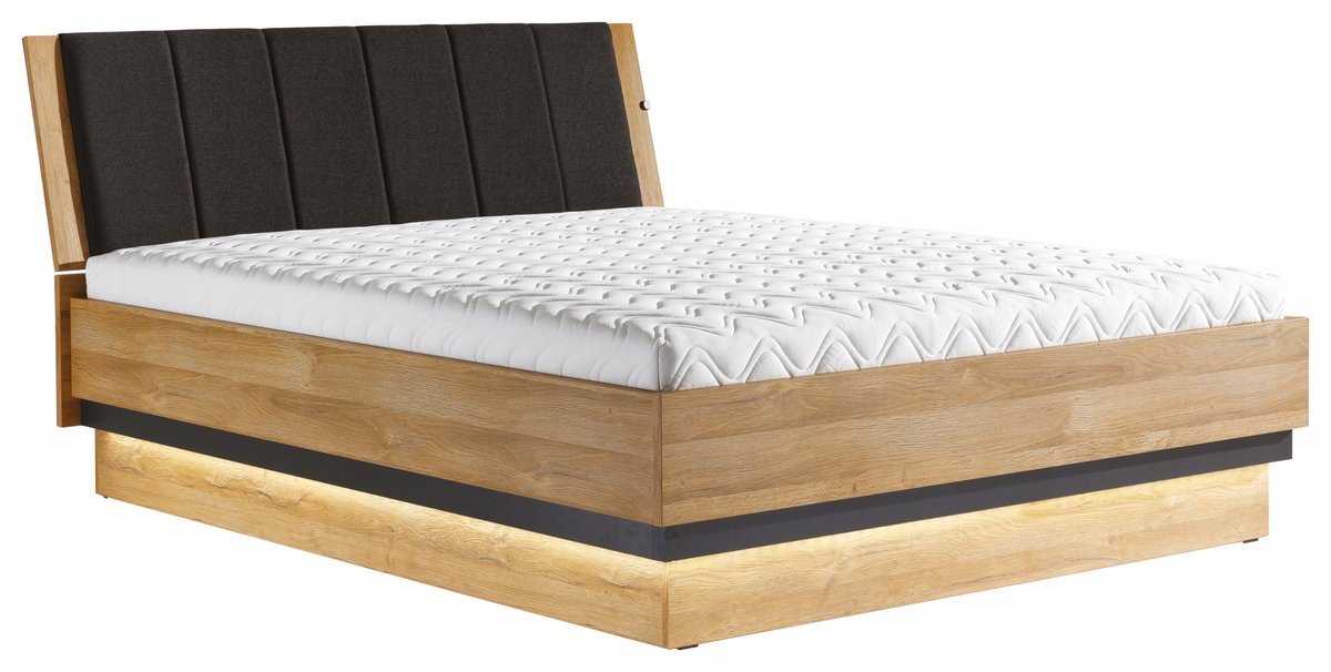 Łóżko sypialniane YORK Y18 na tle innych łóżek wyróżnia się swoją niebanalną formą. Stonowany odcień dębu grandson został zaakcentowany tapicerowanym zagłówkiem i grafitową wstawką, poniżej której znajduje się zwężona podstawa.