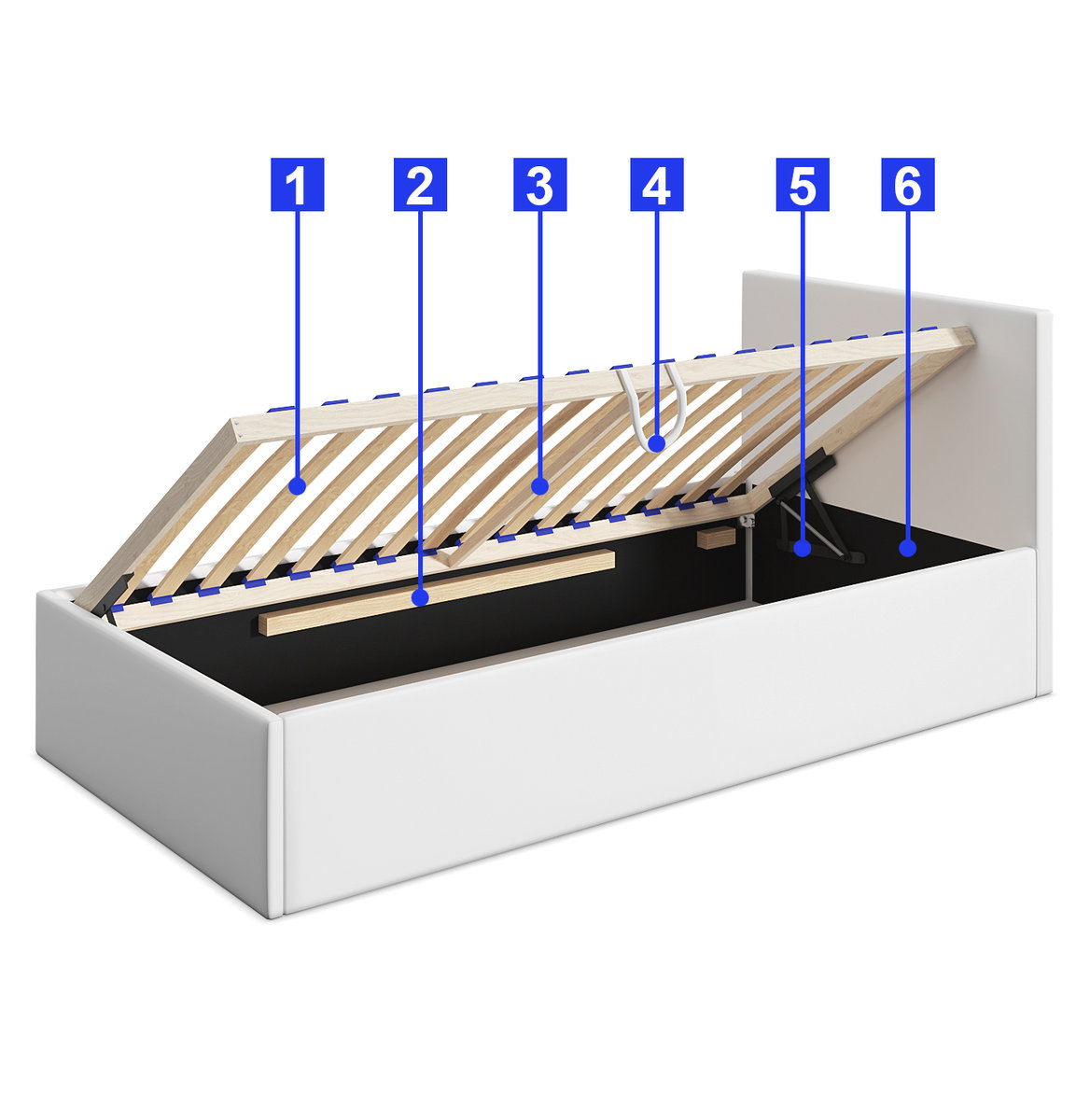 - Metalowe automaty sprężynowe wspomagające otwieranie stelaża oraz utrzymujące go w pozycji otwartej na czas korzystanie z pojemnika na pościel.