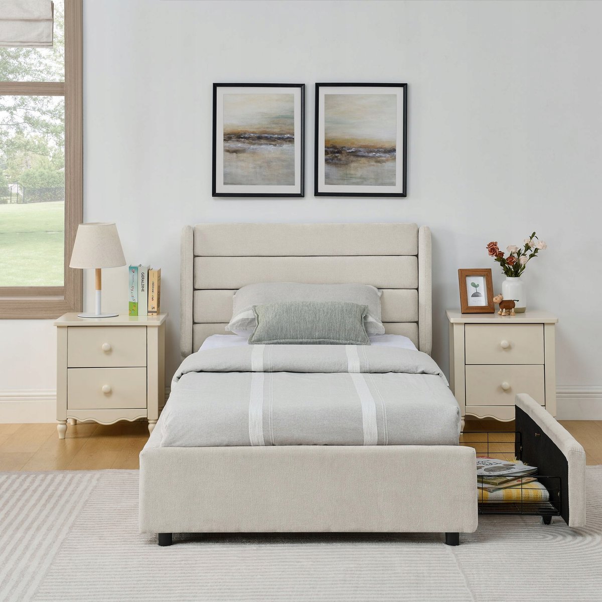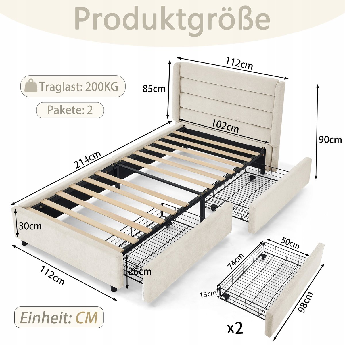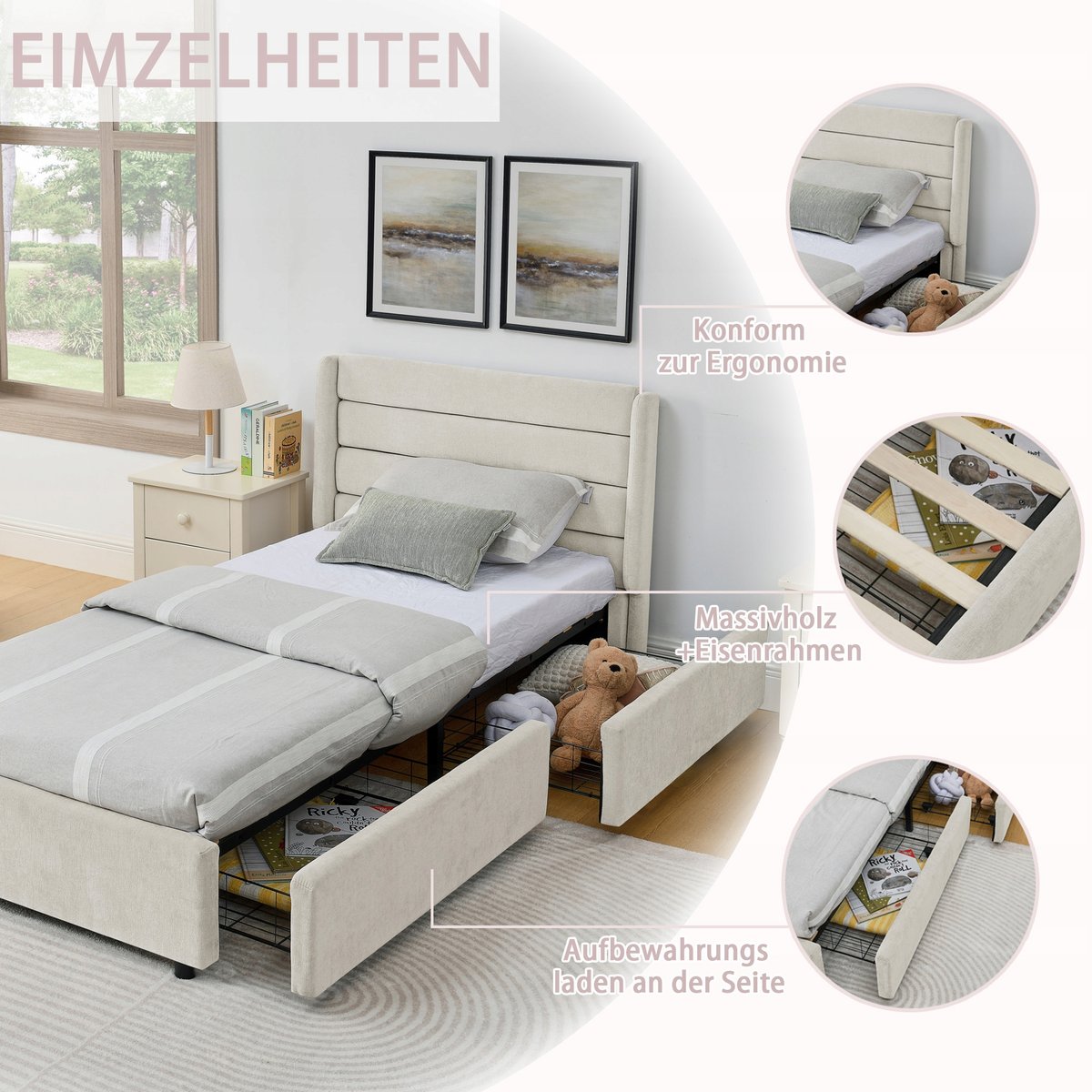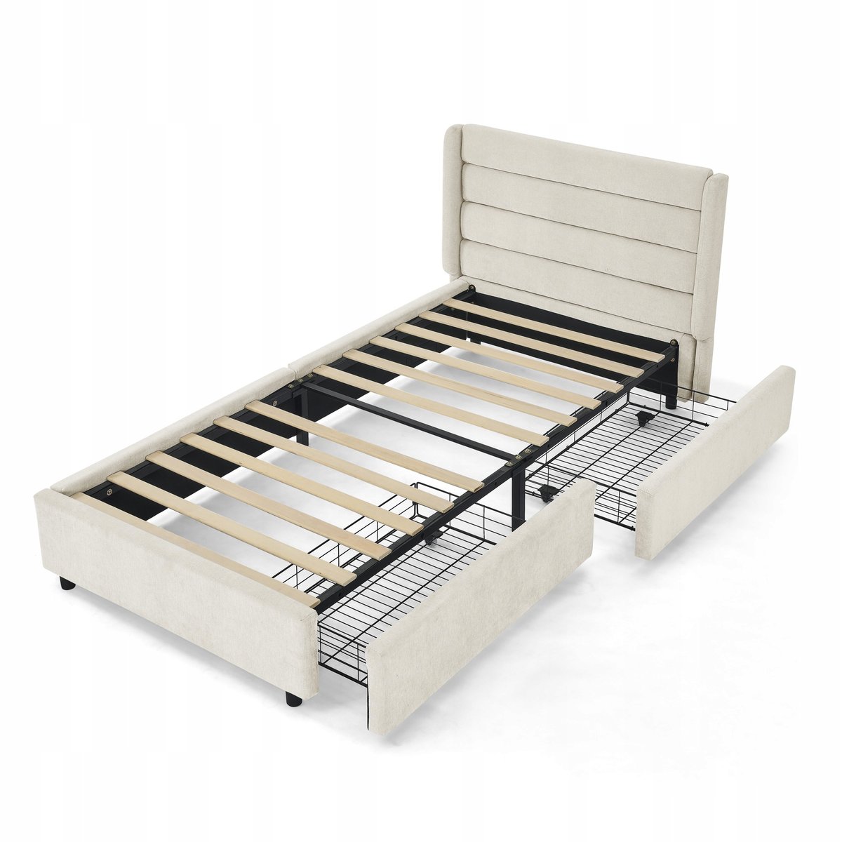 Łóżko pojedyncze 90 x 200 cm, powierzchnia z tkaniny szenilowej, z 2 dużymi szufladami, idealne do pokoju dziecięcego, gabinetu (jako dostawka) i pokoju gościnnego, beżowe (bez materaca)