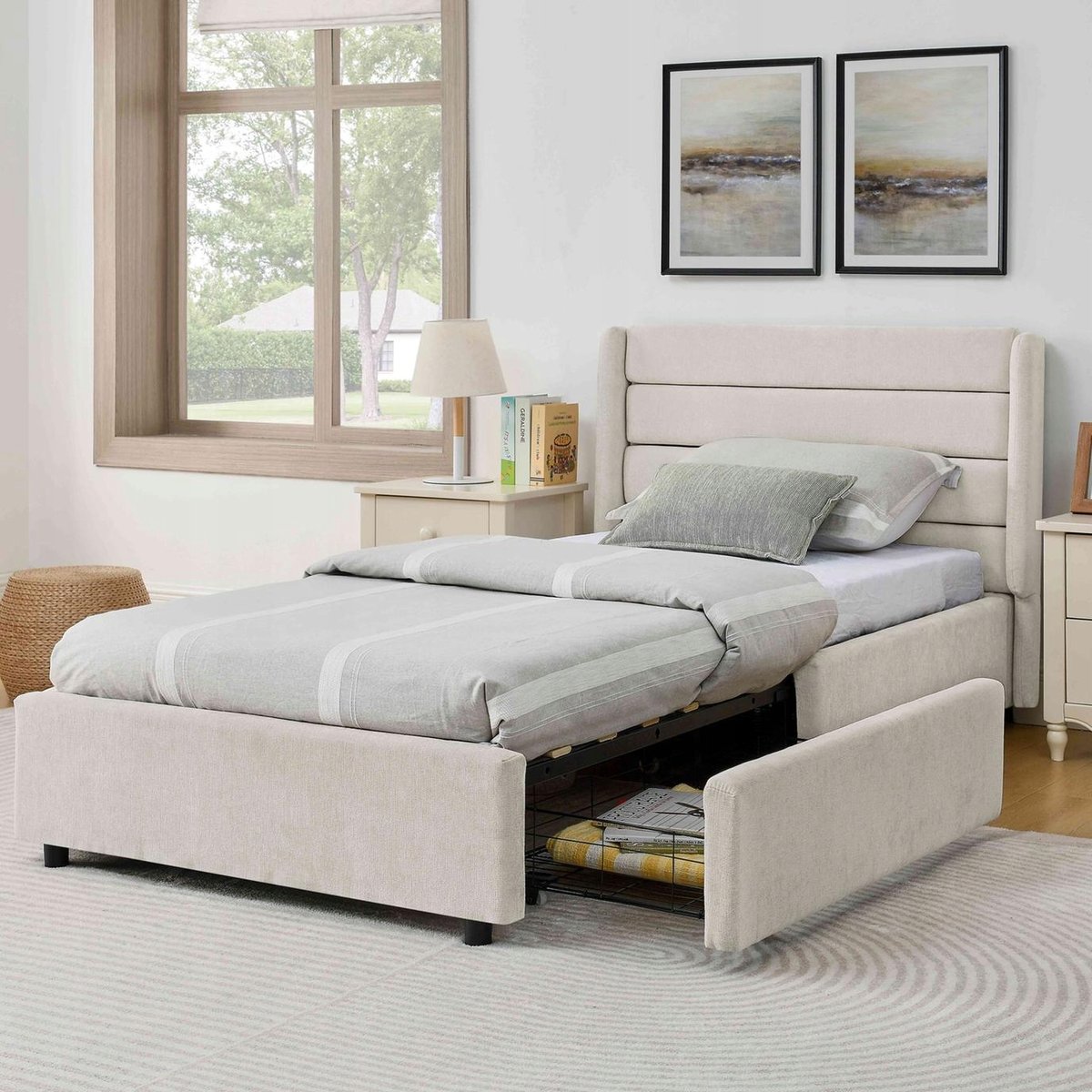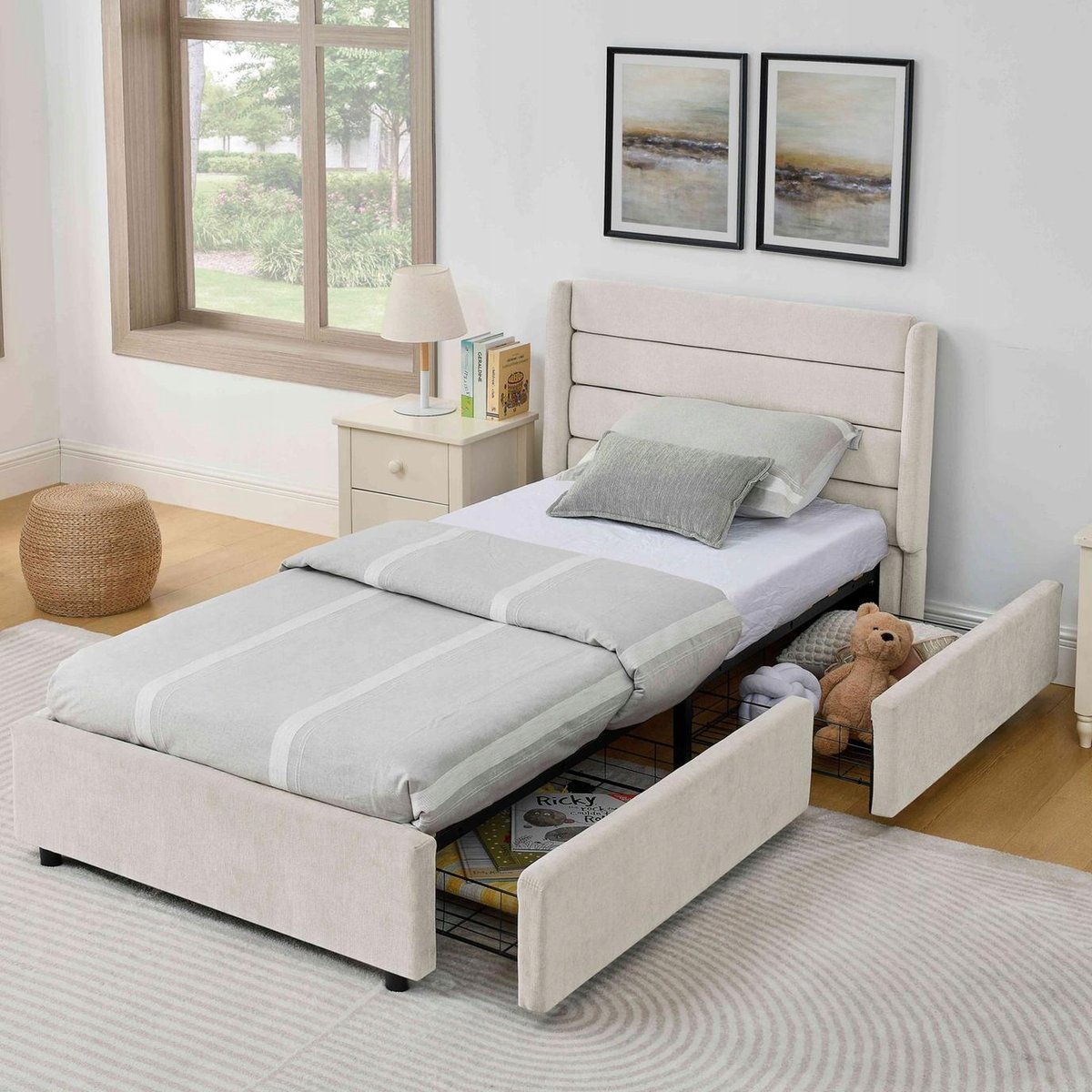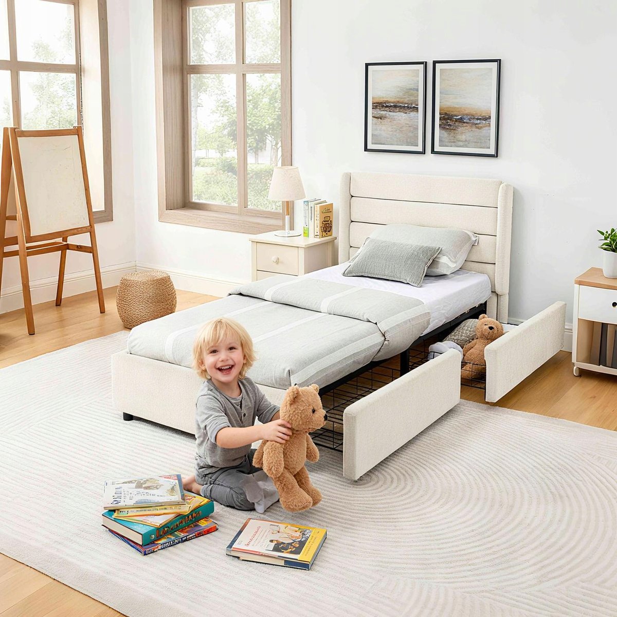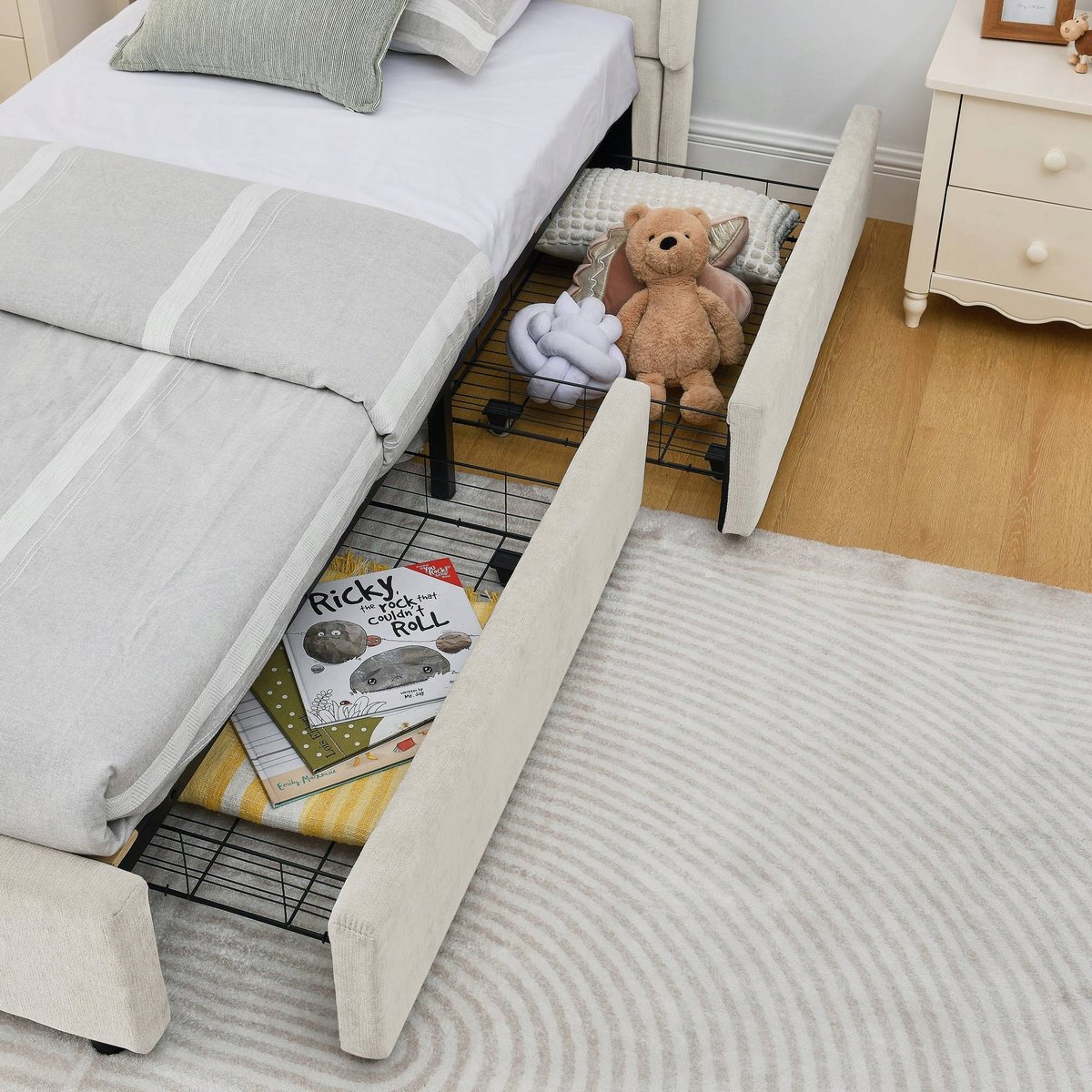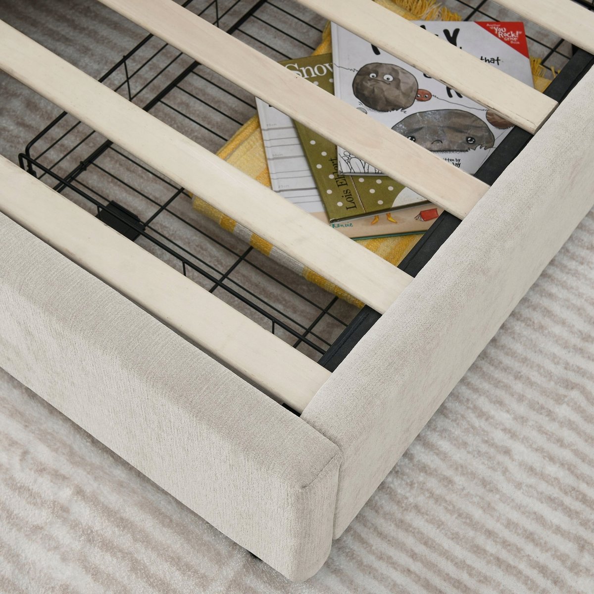 Łóżko pojedyncze 90 x 200 cm, powierzchnia z tkaniny szenilowej, z 2 dużymi szufladami, idealne do pokoju dziecięcego, gabinetu (jako dostawka) i pokoju gościnnego, beżowe (bez materaca)