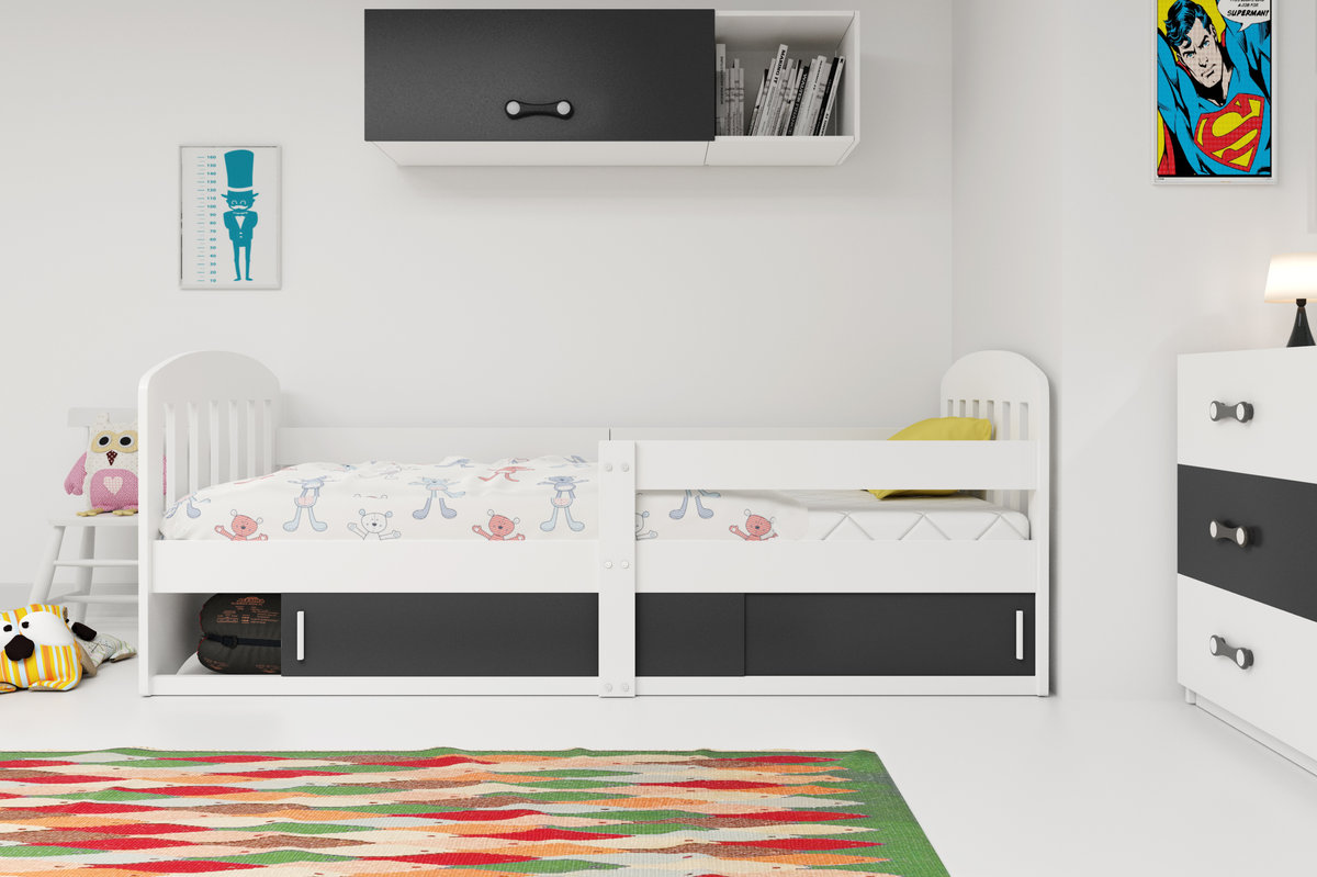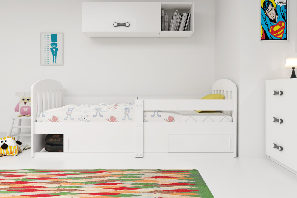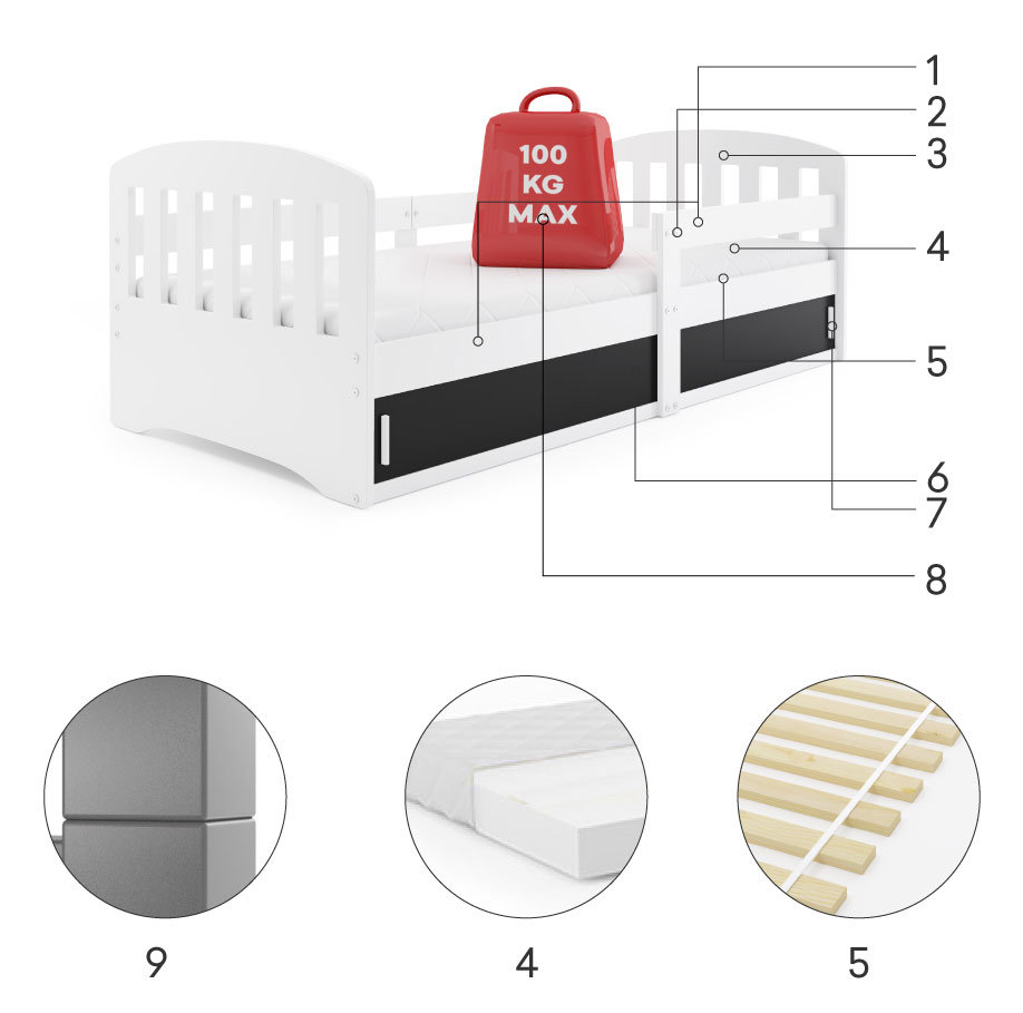 1. Rama łóżka z drewna sosnowego pomalowana lakierem wodnym.2. Śruba stalowa- akcesoria meblowe.3. Płyta Mdf.4. Materac- rozmiar 160x80 ( pikowana tkanina hypoalergiczna wykonana z poliestru + włókno