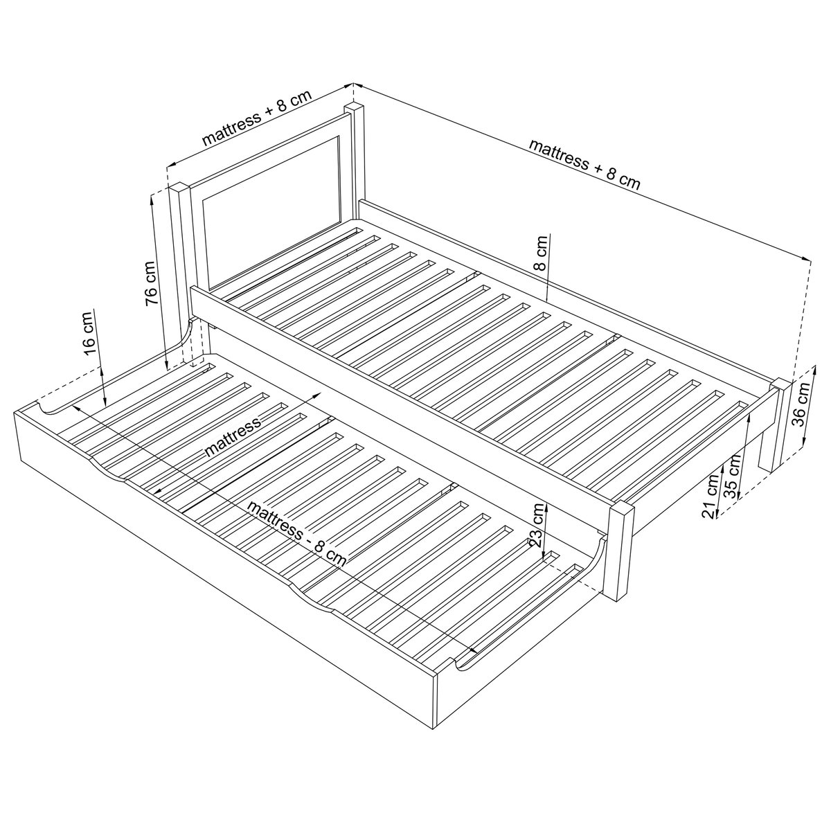 Szuflada pomieści materac o grubości do 14 cm, szerokości takiej samej co materac główny oraz długości mniejszej od niego o co najmniej 8 cm. Przykładowo, dla modelu łóżka pod materac 90x200, maksymalny wymiar materaca jaki zmieści się do szuflady to 90x192 cm. Jej całkowity udźwig wynosi 160 kg.