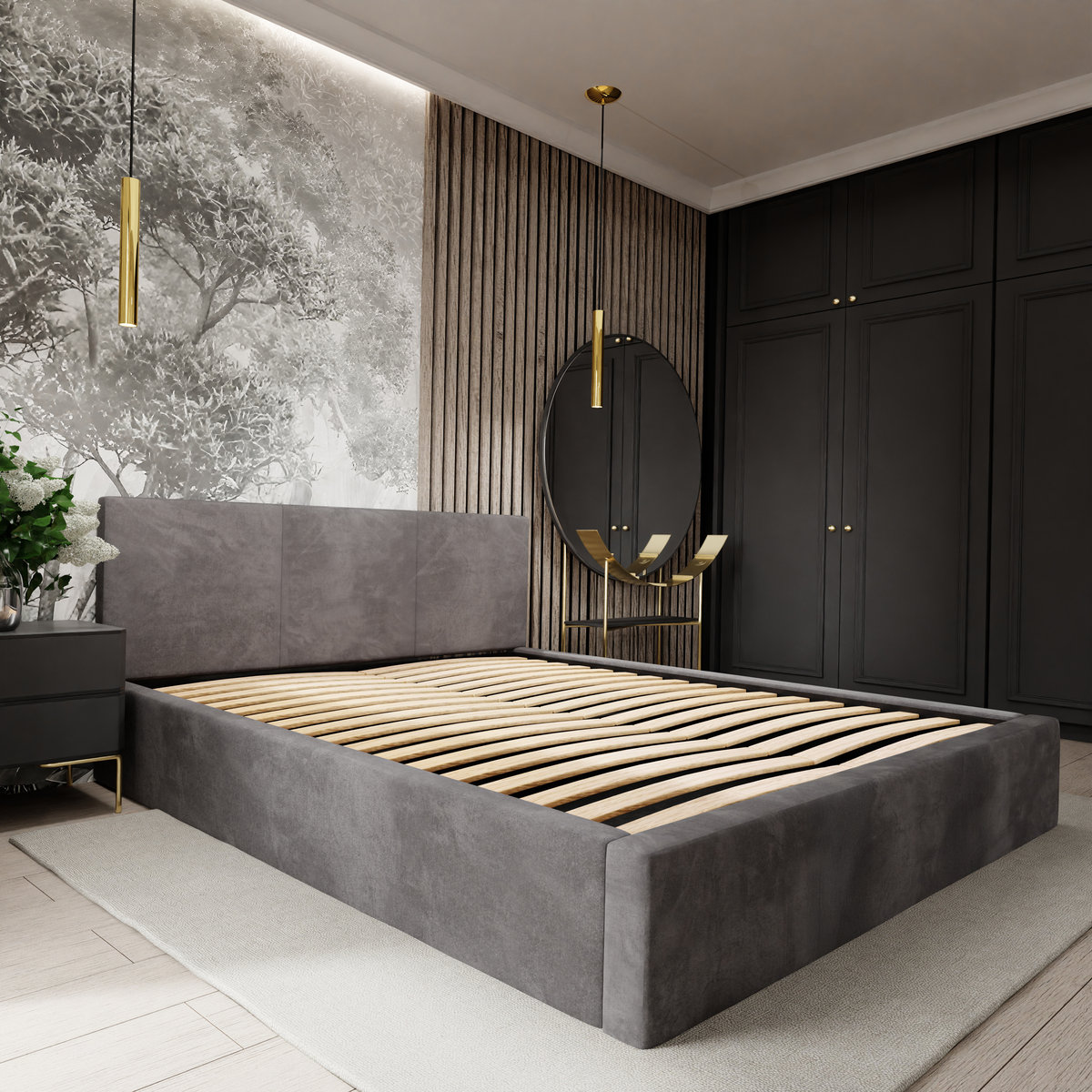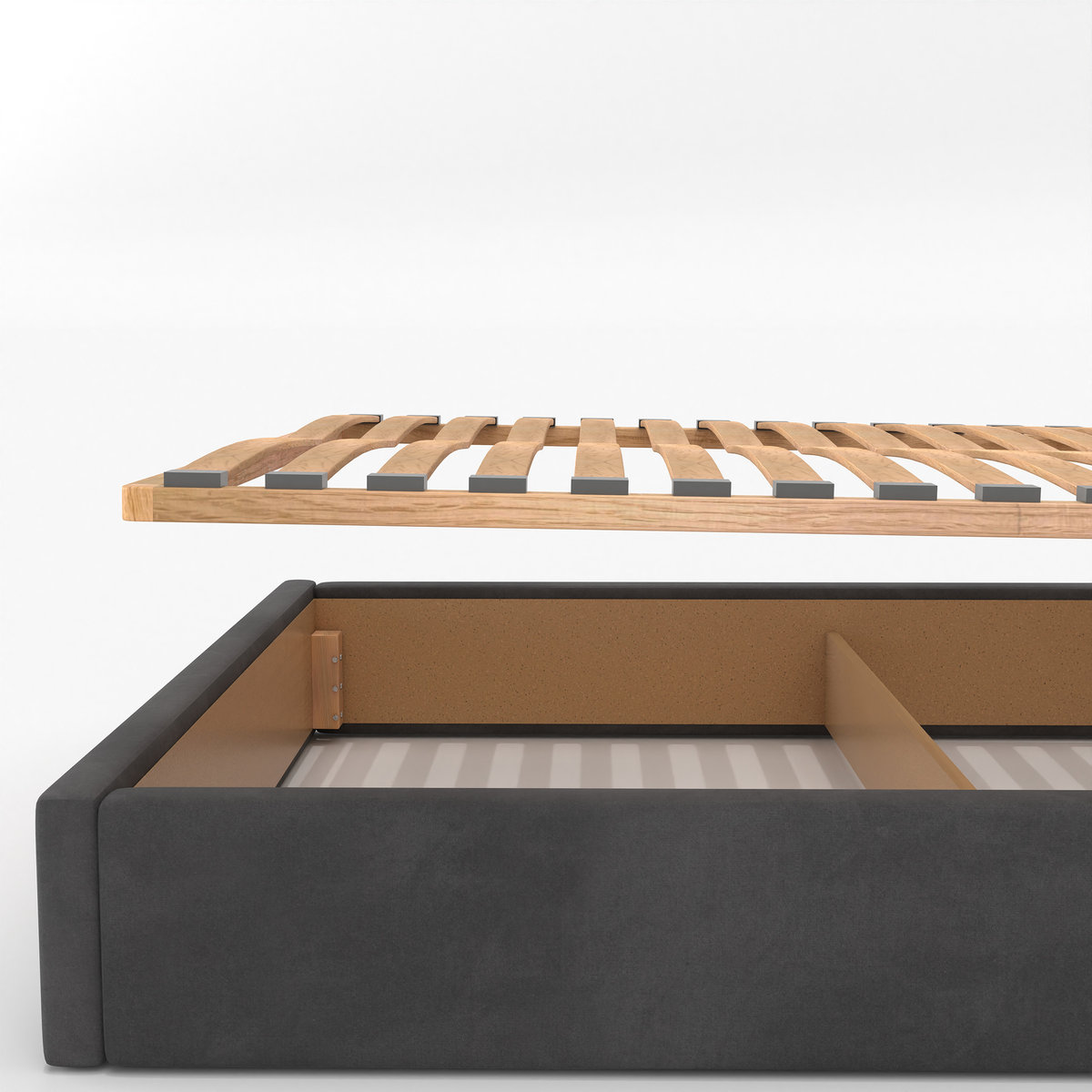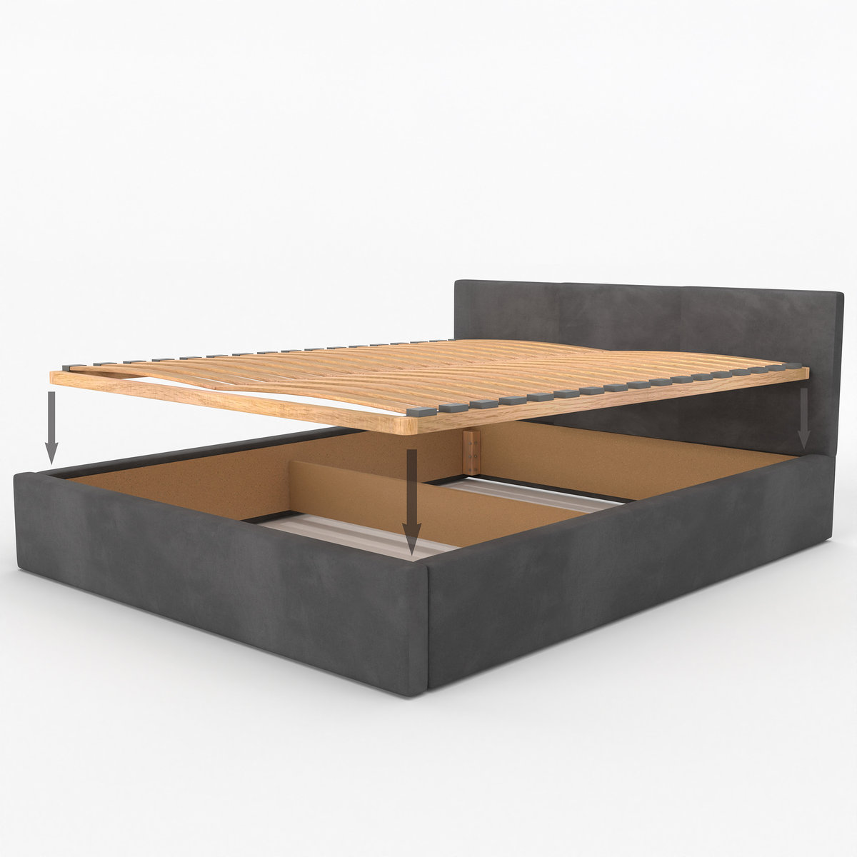Potrzebujesz więcej miejsca na pościel, koce czy sezonowe tekstylia? Ten model łóżka został wyposażony w pojemny schowek, do którego uzyskasz dostęp poprzez zdjęcie lekkiego stelaża.