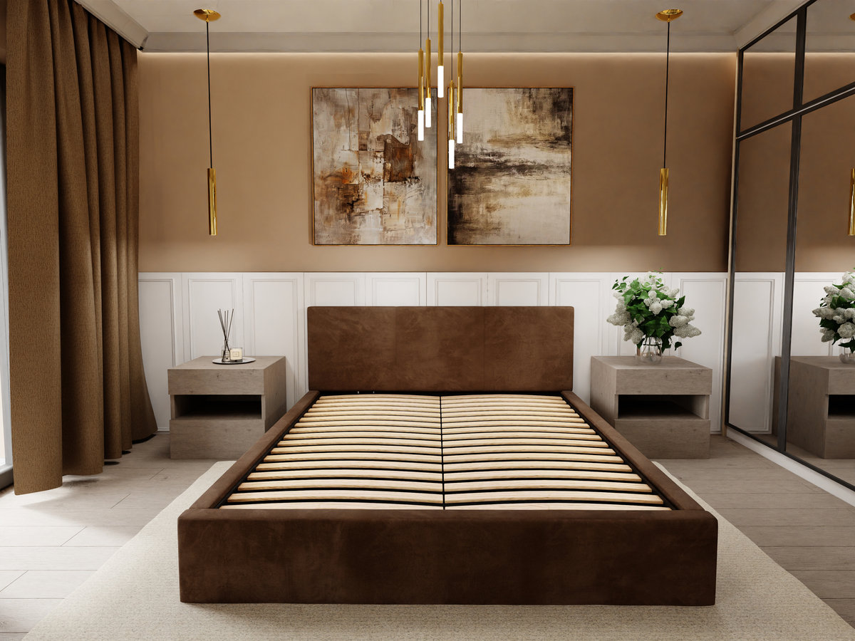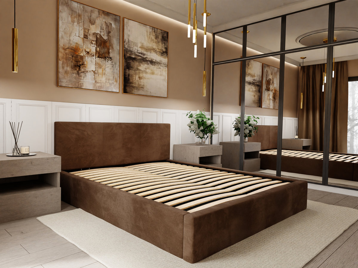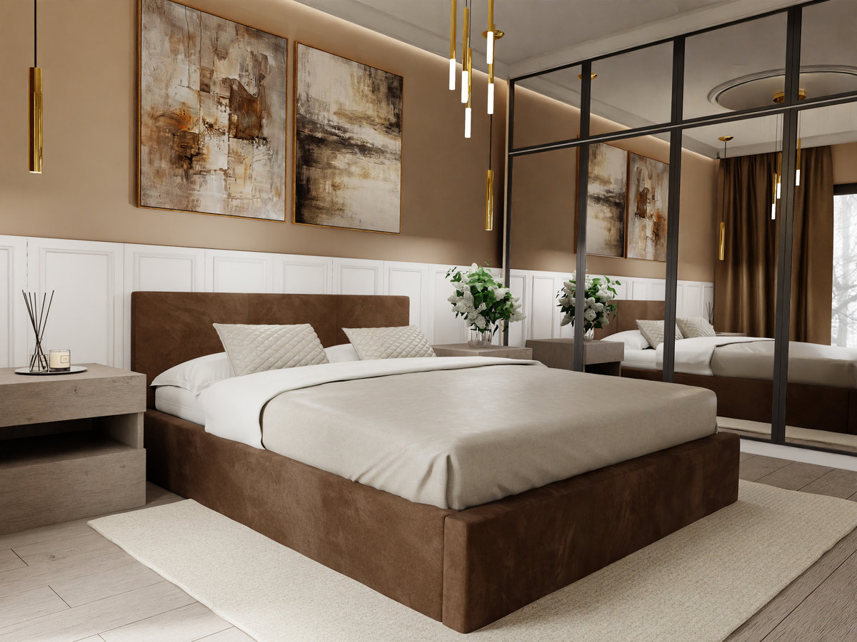 ŁÓŻKO TAPICEROWANE DO SYPIALNI 140cm x 200cm ŁÓŻKO PODWÓJNE Z POJEMNIKIEM BRĄZOWE Stylowe łóżko tapicerowane z pojemnikiem na pościel 140x200cm to idealne rozwiązanie dla osób ceniących wygodę, ...