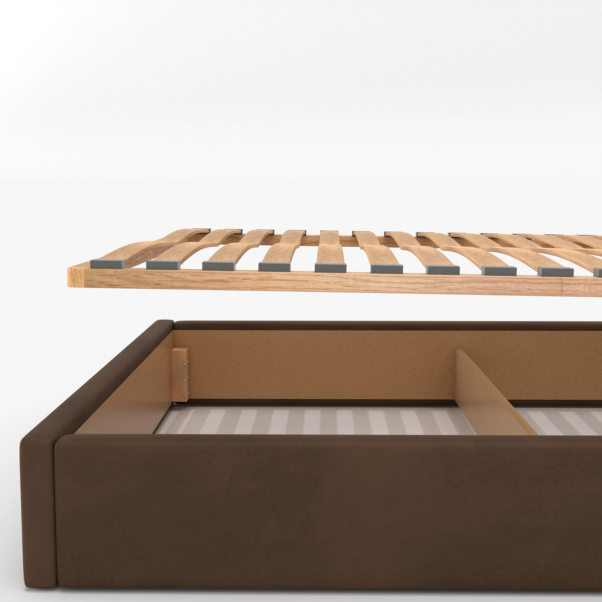 Potrzebujesz więcej miejsca na pościel, koce czy sezonowe tekstylia? Ten model łóżka został wyposażony w pojemny schowek, do którego uzyskasz dostęp poprzez zdjęcie lekkiego stelaża.