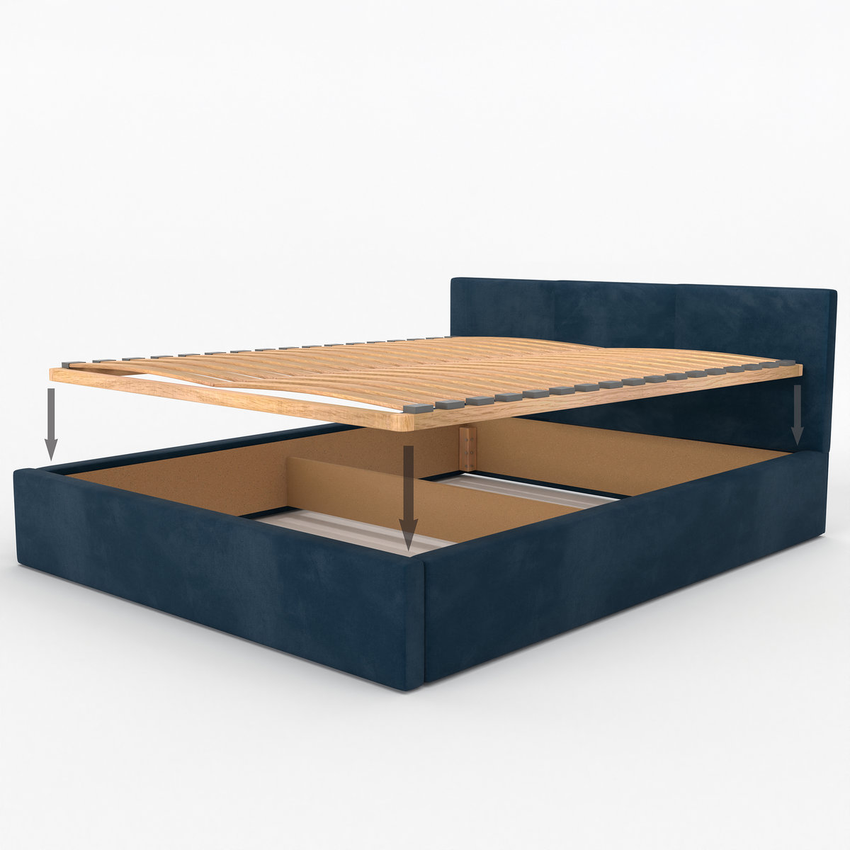 Potrzebujesz więcej miejsca na pościel, koce czy sezonowe tekstylia? Ten model łóżka został wyposażony w pojemny schowek, do którego uzyskasz dostęp poprzez zdjęcie lekkiego stelaża.