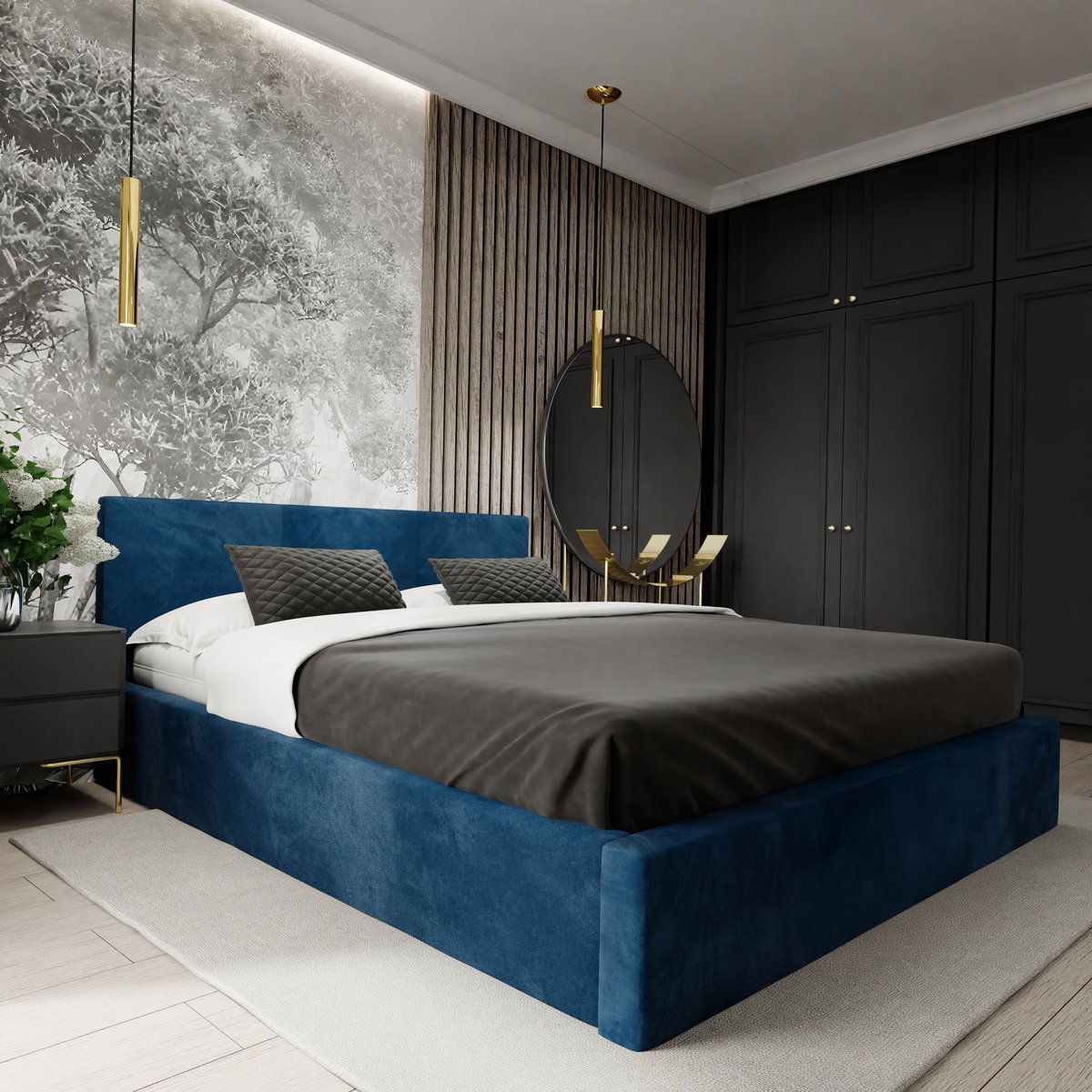 ŁÓŻKO TAPICEROWANE DO SYPIALNI 140cm x 200cm ŁÓŻKO PODWÓJNE Z POJEMNIKIEM GRANATOWE Stylowe łóżko tapicerowane z pojemnikiem na pościel 140x200cm to idealne rozwiązanie dla osób ceniących wygodę, ...