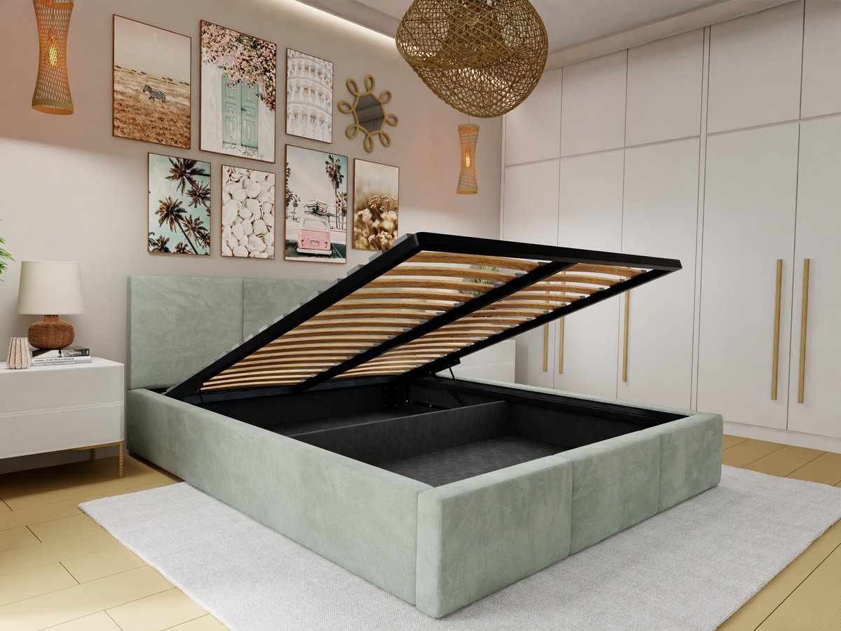 ŁÓŻKO TAPICEROWANE DO SYPIALNI 140cm x 200cm ŁÓŻKO PODWÓJNE Z POJEMNIKIEM MIĘTOWE Stylowe łóżko tapicerowane z pojemnikiem na pościel 140x200cm to idealne rozwiązanie dla osób ceniących wygodę, ...