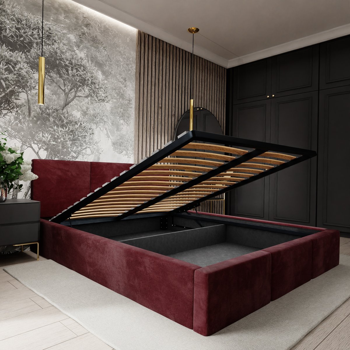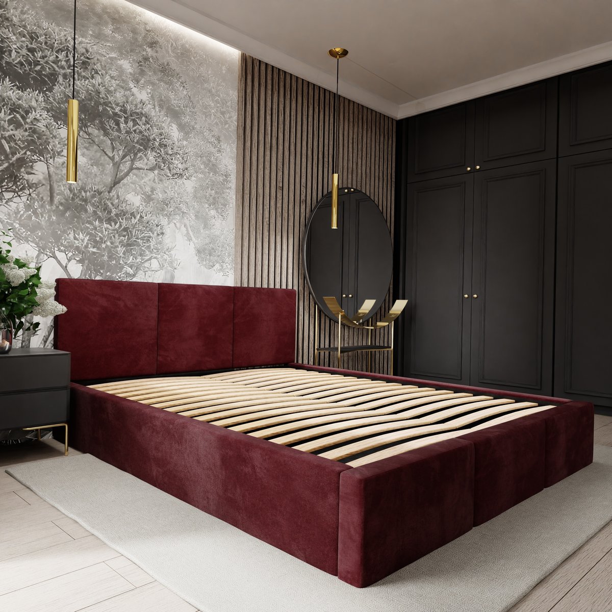 ŁÓŻKO TAPICEROWANE DO SYPIALNI 160cm x 200cm ŁÓŻKO PODWÓJNE Z POJEMNIKIEM BORDOWE Stylowe łóżko tapicerowane z pojemnikiem na pościel 160x200cm to idealne rozwiązanie dla osób ceniących wygodę, ...