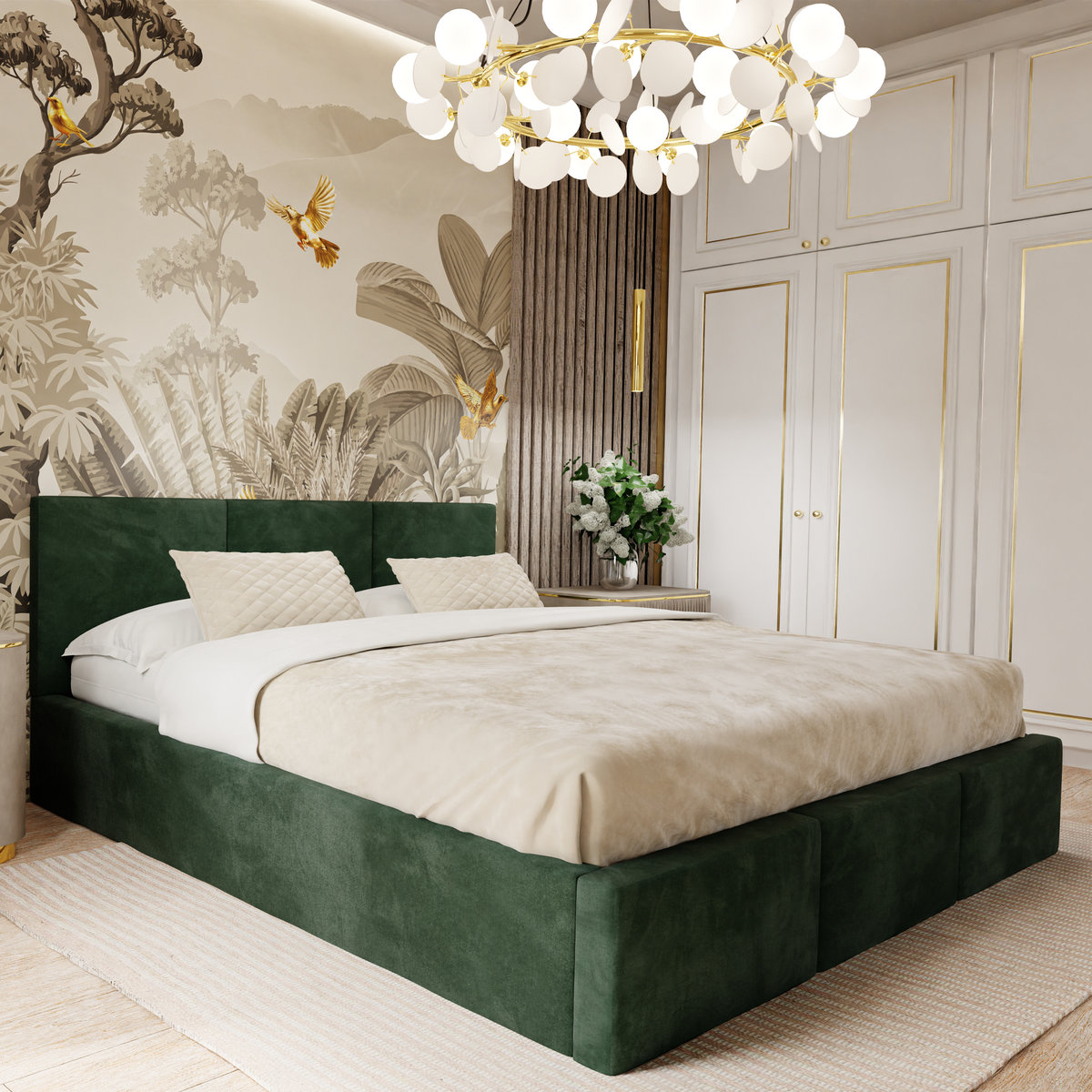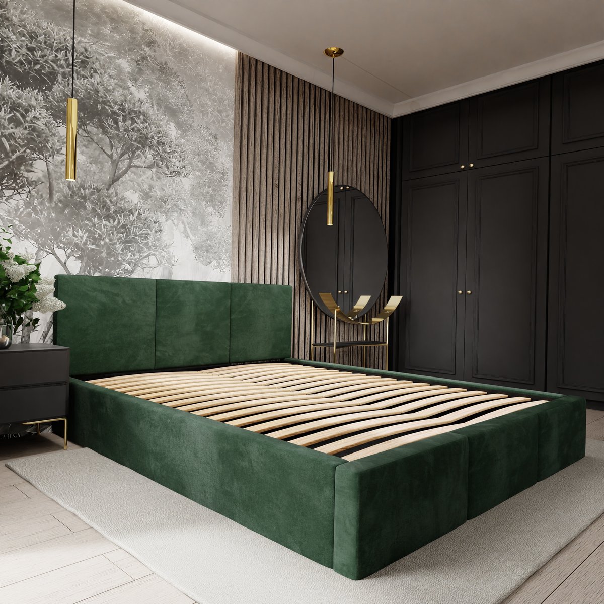 ŁÓŻKO TAPICEROWANE DO SYPIALNI 160cm x 200cm ŁÓŻKO PODWÓJNE Z POJEMNIKIEM BUTELKOWA ZIELEŃ Stylowe łóżko tapicerowane z pojemnikiem na pościel 160x200cm to idealne rozwiązanie dla osób ceniących ...