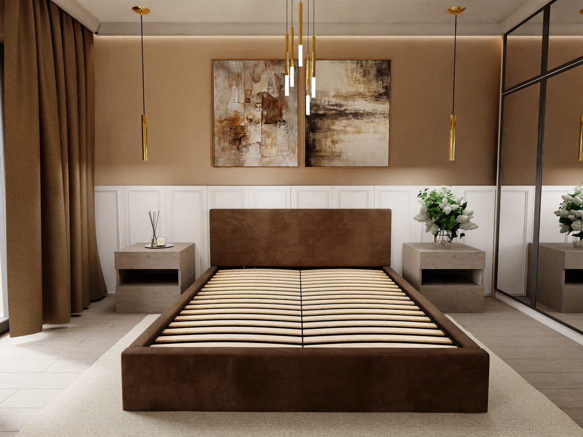ŁÓŻKO TAPICEROWANE DO SYPIALNI 180cm x 200cm ŁÓŻKO PODWÓJNE Z POJEMNIKIEM BRĄZOWE Stylowe łóżko tapicerowane z pojemnikiem na pościel 180x200cm to idealne rozwiązanie dla osób ceniących wygodę, ...