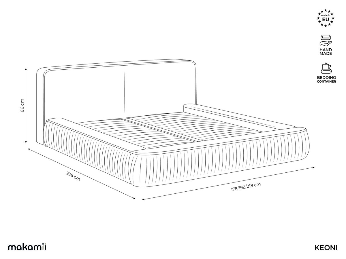 Łóżko tapicerowane Keoni łączy w sobie luksusowy komfort z praktycznymi funkcjami i trwałą konstrukcją. Pokrowiec z aksamitnej tkaniny jest nie tylko wyjątkowo miękki, ale także idealny dla właścicieli zwierząt domowych, dzięki gęstej strukturze splotu, która ogranicza mechacenie się i pozostaje trwała. Lekki połysk tkaniny wnosi elegancki akcent do Twojej sypialni i pasuje zarówno do nowoczesnych, jak i klasycznych stylów wnętrz.