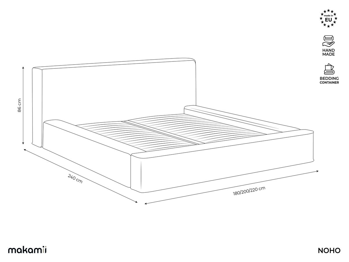 Łóżko tapicerowane ze skrzynią Noho zachwyca prostą elegancją i przemyślaną funkcjonalnością. Dzięki szerokości 200 cm, głębokości 240 cm i wysokości 86 cm tworzy harmonijną atmosferę w każdym pomieszczeniu. Obszerny zagłówek o wysokości 50 cm zachęca do relaksu i zapewnia dodatkowy komfort.