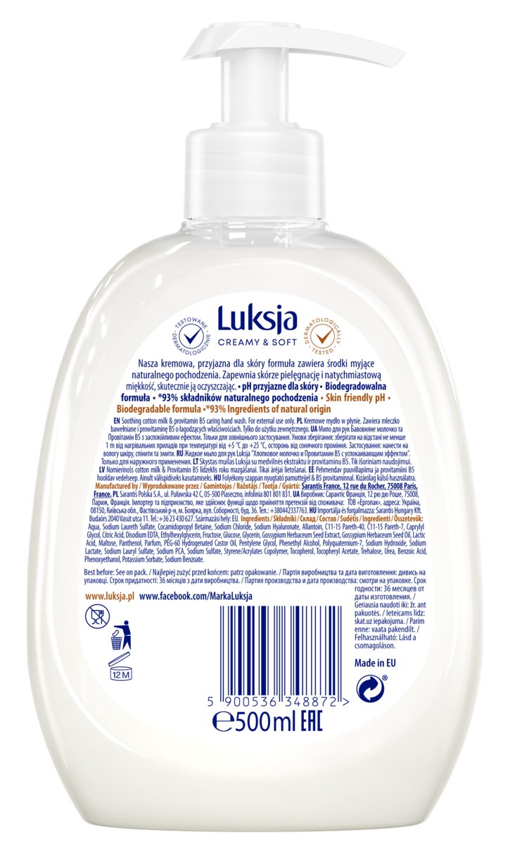 | Nazwa: | Luksja, Creamy & Soft, Łagodzące Kremowe Mydło w płynie Mleczko Bawełniane i Prowitamina B5, 500ml |