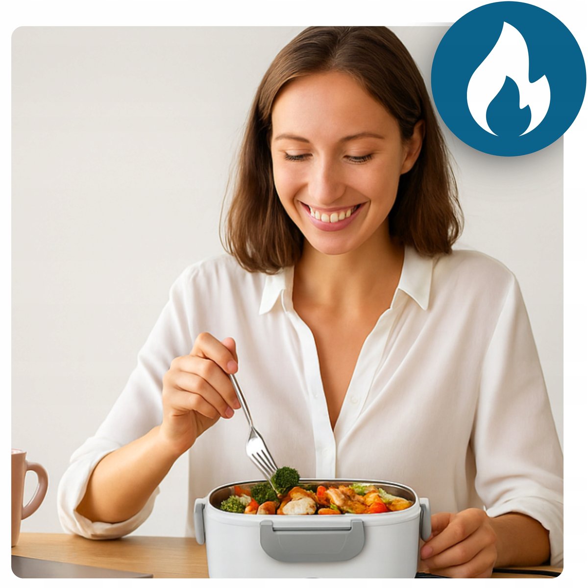 Korzystanie z lunchboxa jest niezwykle intuicyjne i pozwala na szybkie podgrzanie posiłku w niemal każdych warunkach, bez potrzeby używania kuchenki mikrofalowej.