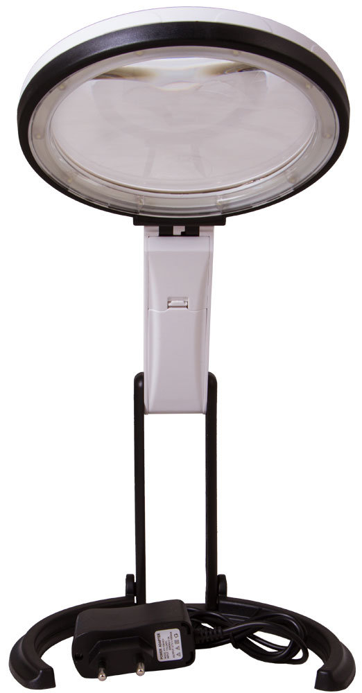 Obszar roboczy jest równomiernie podświetlony dzięki dziesięciu diodom LED umieszczonym na ramie soczewki. Przełącznik znajduje się w górnej części korpusu soczewki. Lupa jest dostarczana wraz z zasilaczem, ale może być także zasilana dwiema bateriami AA (nie są one dołączone do zestawu).