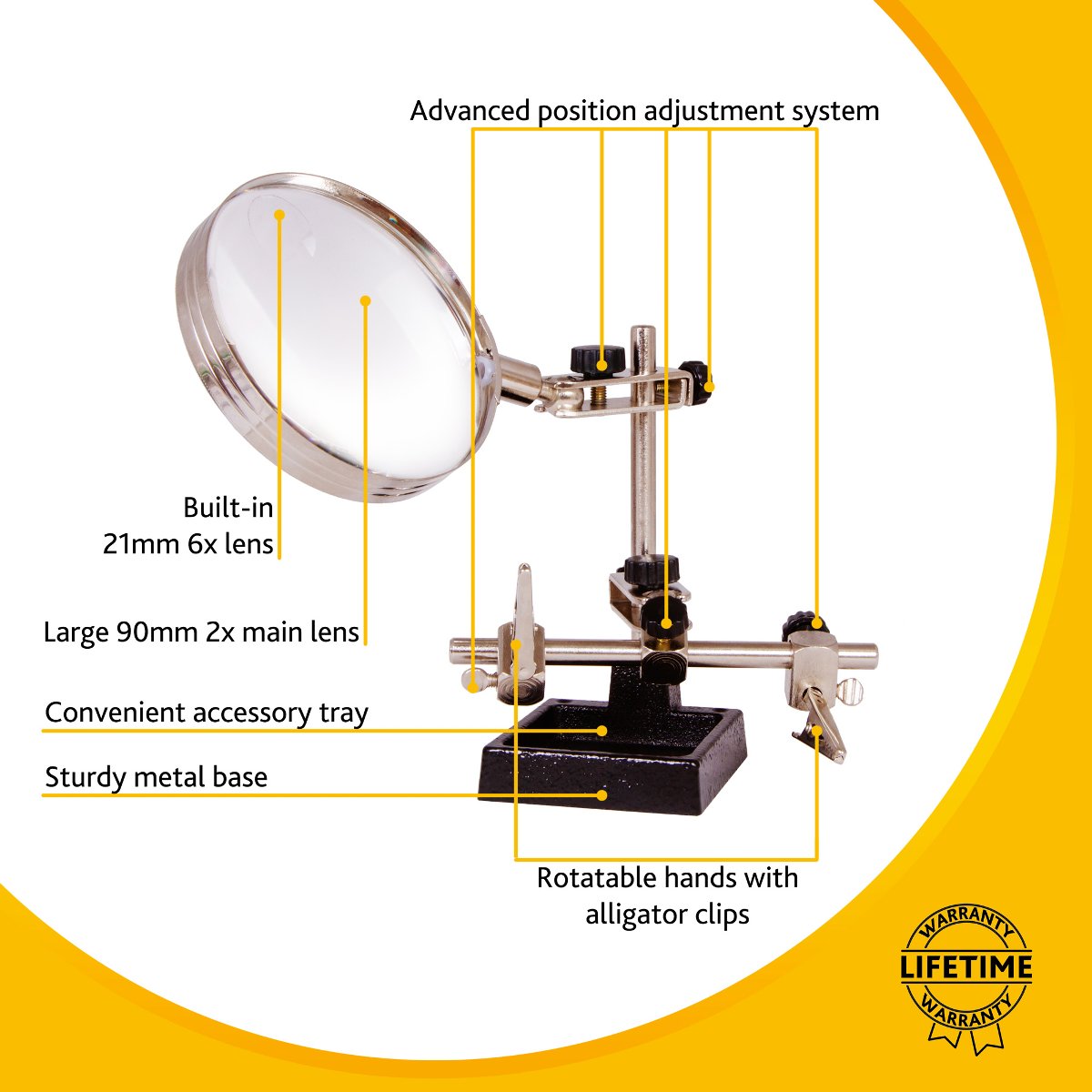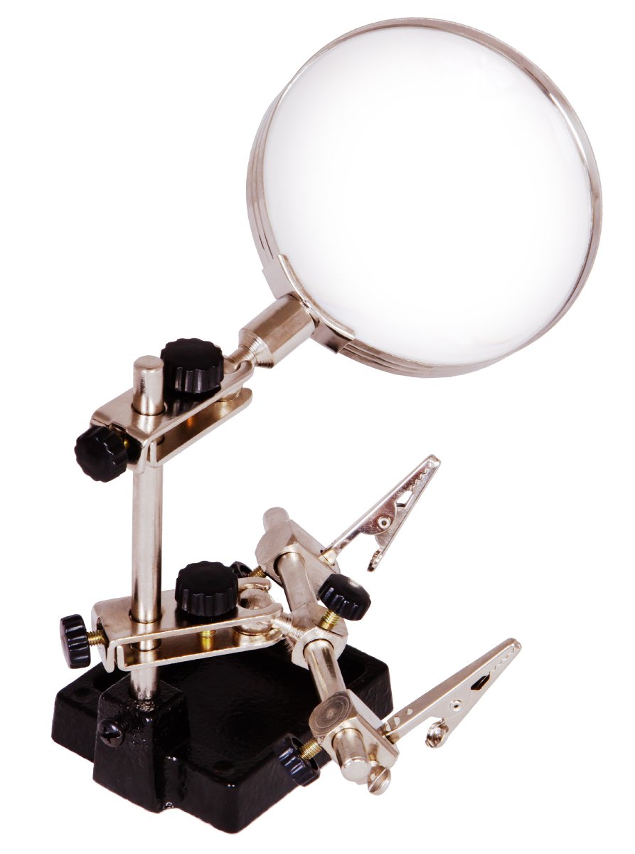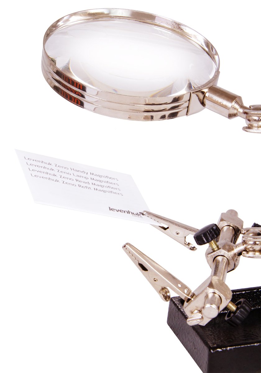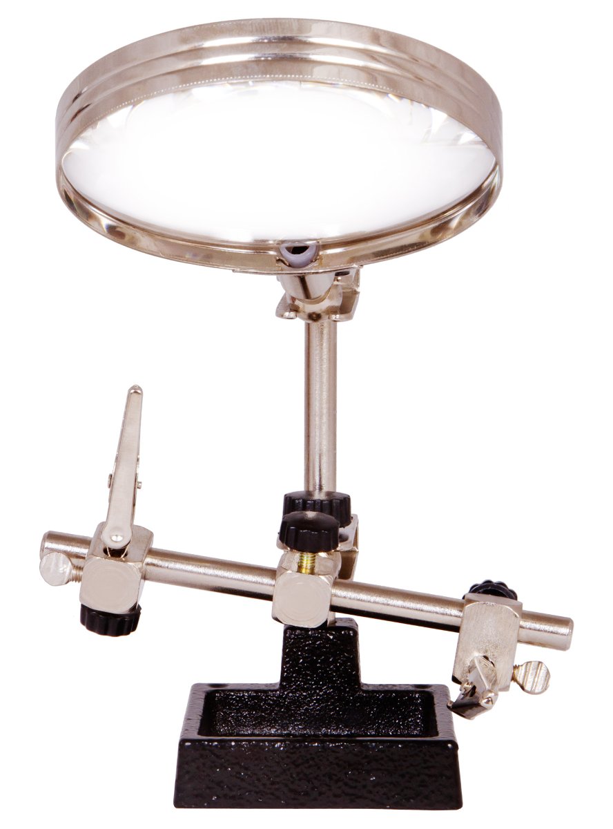 Wszystkie lupy w tej serii mają uchwyty z zaciskami pomocniczymi do pewnego mocowania przedmiotów. Właściwości: Soczewka dwuogniskowa z optycznego tworzywa sztucznego Dwa powiększenia: 2 i 6 razy Dwa uchwyty z zaciskami Tacka na akcesoria Postawa z dociążeniem Marka Levenhuk, Inc., USA Gwarancja, lata bezterminowa
