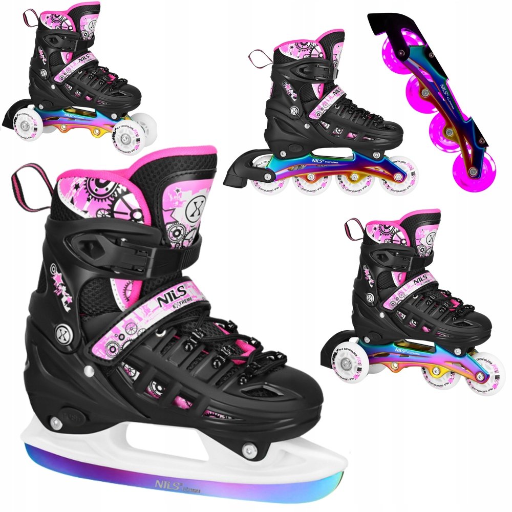 NH10905 Set Nils Extreme to wyjątkowy model 4w1 – oferujący możliwość konfiguracji jako łyżwy, łyżworolki, wrotki oraz rolko-wrotki. To doskonała propozycja dla osób, które chcą aktywnie spędzać czas przez cały rok. Dzięki świecącym kółkom LED, model ten wyróżnia się również atrakcyjnym wyglądem.