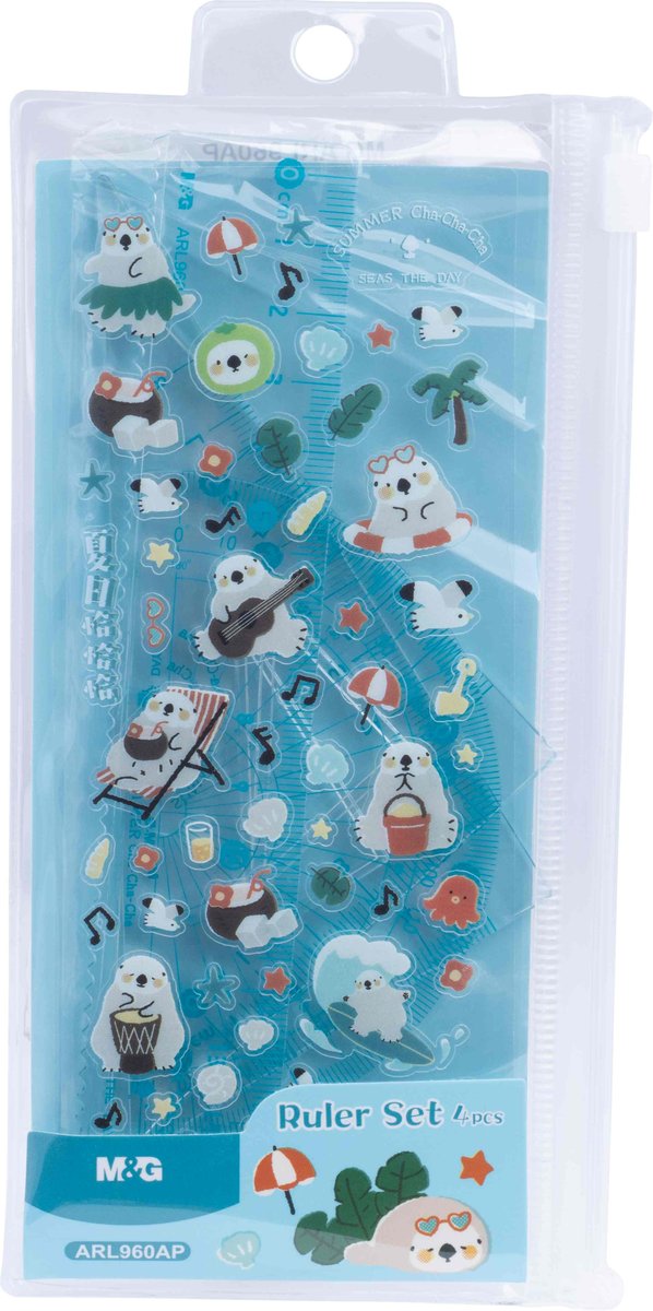 Zestaw zawiera 4 elementy: linijka 15 cm,2 ekierki, kątomierz,naklejki do personalnego ozdobieniazamykane etui