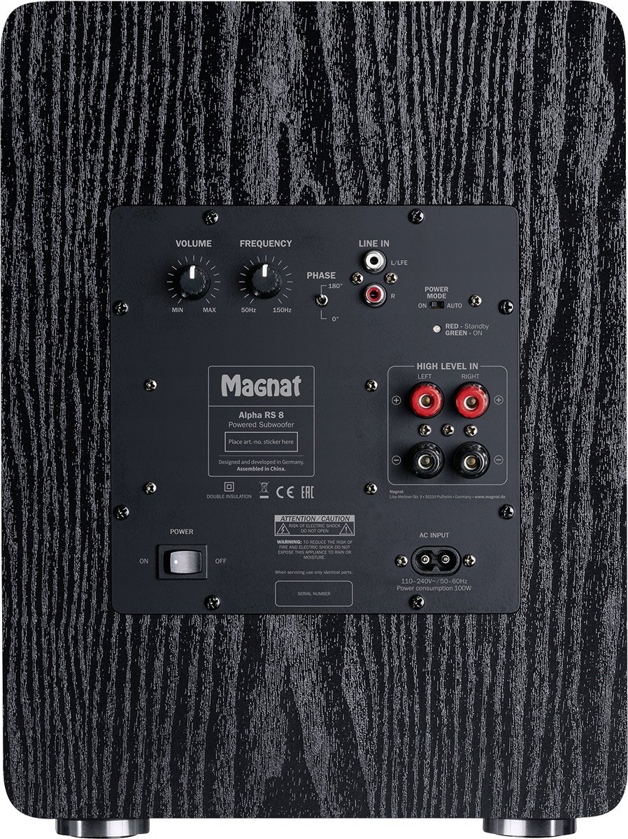 Magnat Alpha RS 8 wyposażony jest w 200-milimetrowy (8-calowy) woofer o dużym skoku membrany w obudowie typu bass-reflex, który jest wyposażony w dwa porty Airflex. Zintegrowany wzmacniacz klasy D zapewnia 80 watów mocy ciągłej, a moc szczytowa to imponujące 160 watów. Technologia zastosowana w RS8 umożliwia reprodukcję częstotliwości do 25 Hz. Elektronika wzmacniacza umożliwia regulację głośności, częstotliwości podziału i fazy, umożliwiając tym samym optymalne dostosowanie do akustyki pomieszczenia.