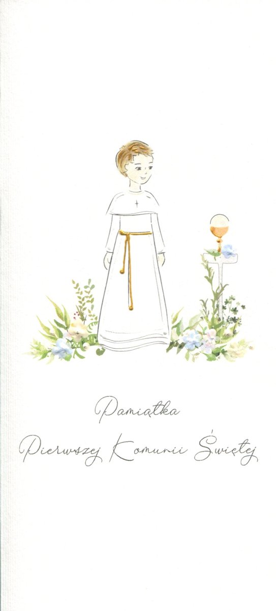 karnet z okazji Komunii Świętej firmy MAK ręcznie malowany farbami akrylowymi wymiary: 21 cm x 10 cm papier biały, delikatnie tłoczony, matowy gramatura 200 g/ m2 w zestawie koperta i ...