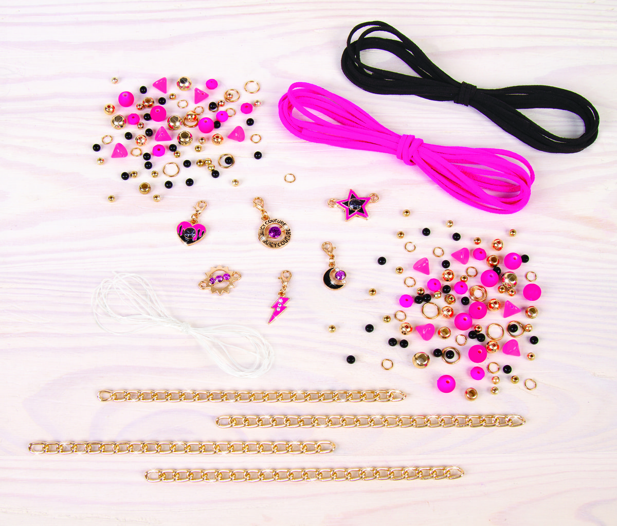 Czarne pudełko ze złotymi zdobieniami w swoim wnętrzu skrywa elementy niezbędne do samodzielnego wykonania unikatowych błyskotek. Znajdują się tam charmsy Juicy Couture zdobione kryształkami Swarovskiego, 132 wielobarwne koraliki, 30 metalowych kółeczek oraz kolorowe tasiemki niezbędne do stworzenia ośmiu oryginalnych bransoletek.