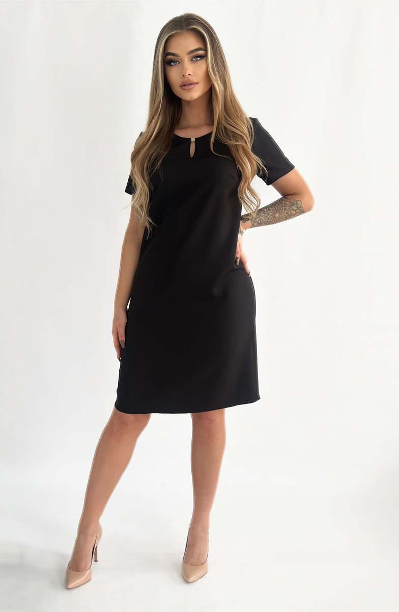 Klasyczna prosta a zarazem elegancka sukienka z biżuteryjną ozdobą przy dekolcie będzie idealnym wyborem na różne okazje, przyjęcia, komunie, chrzciny czy wesela. Idealnie sprawdzi się również na przyjęcia biznesowe czy spotkania ze znajomymi.