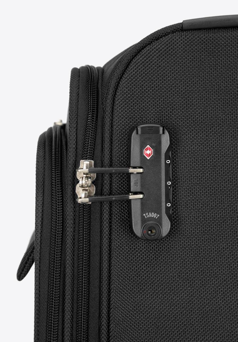 zamek z szyfrem TSA – bardzo przydatny w przypadku rewizji bagażu przez służby celne – gwarantuje on bezinwazyjne otwarcie walizki oraz jej ponowne zamknięcie, bez uszkodzenia zamka;