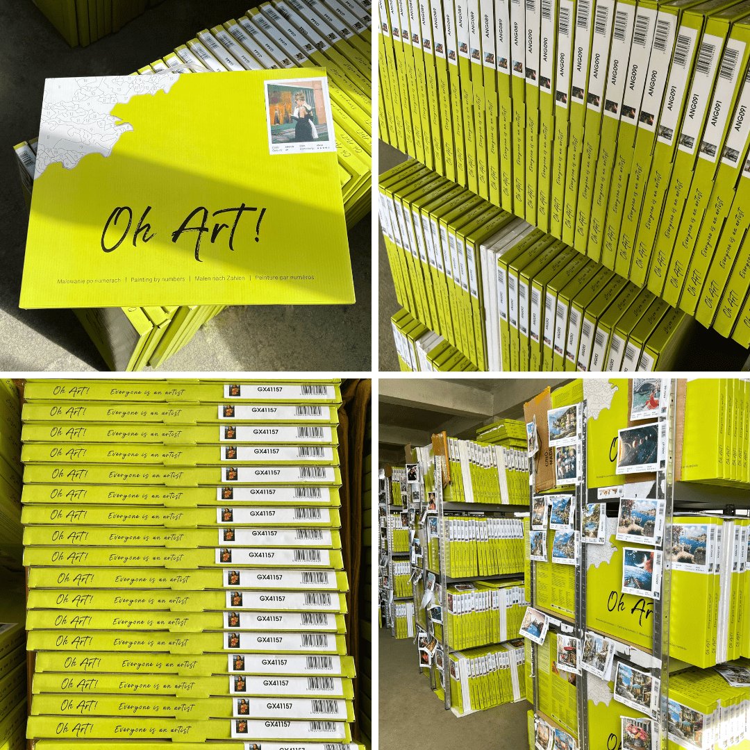 Zestaw jest zapakowany w firmowe, kolorowe opakowanie z logo "Oh Art!" i z wygodną rączką, które idealnie nadaje się na prezent i zabezpiecza obraz w transporcie.