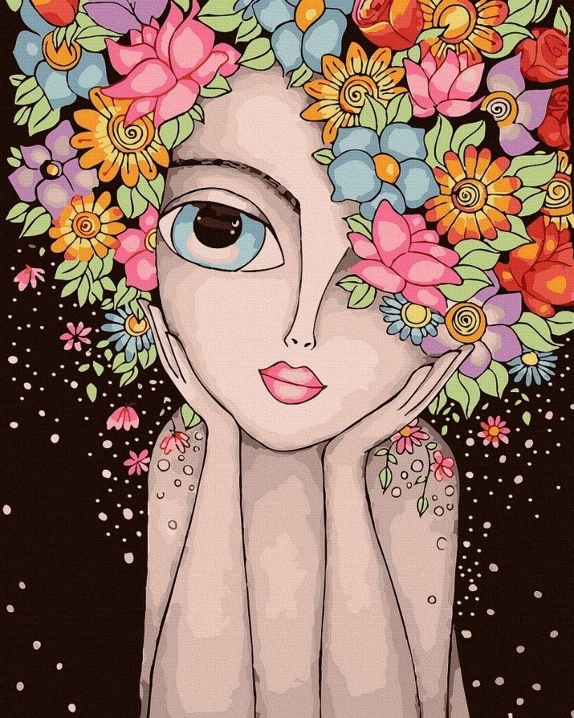 Uroczy, bajkowy portret dziewczyny z ogromnymi oczami i kolorową koroną z kwiatów. Idealna dla dzieci i wszystkich kochających radość. Poziom trudności: średni.Wymiary: 40x50 cm.Zawiera: płótno na ...