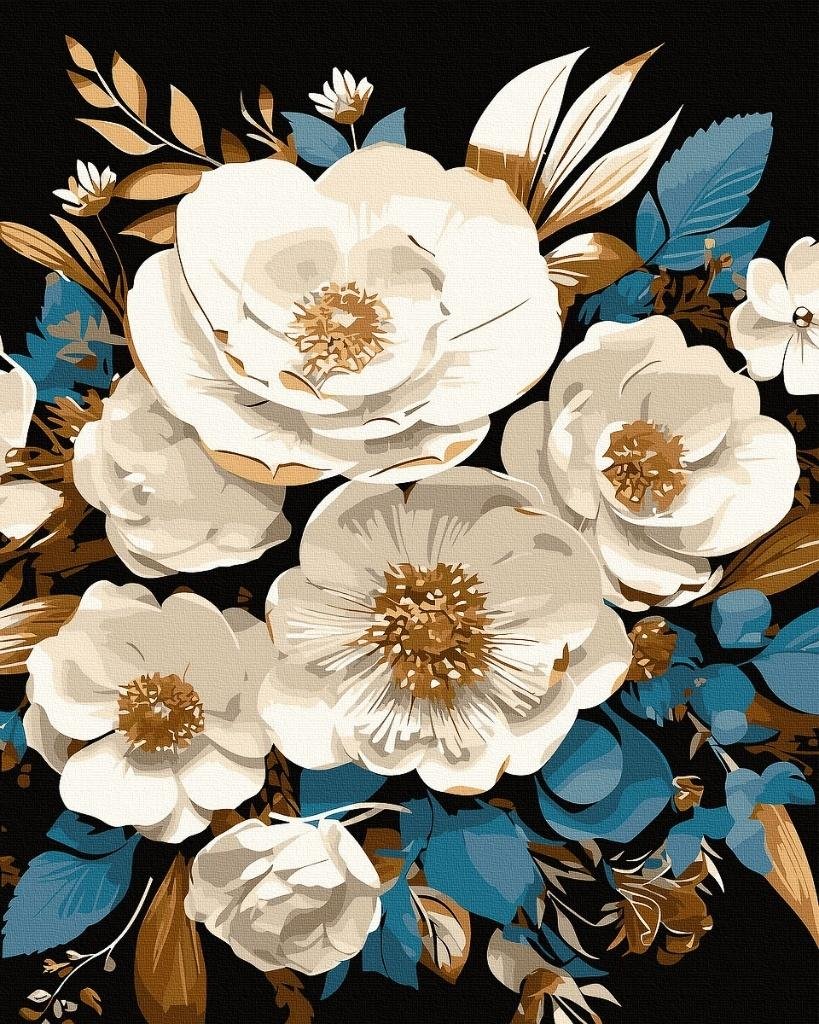 Delikatne, kremowe kwiaty na tle głębokiej czerni tworzą elegancki i wyrafinowany motyw. Idealny wybór dla miłośników klasyki i stylowych dekoracji wnętrz.Poziom trudności: średniWymiary: 40x50 ...
