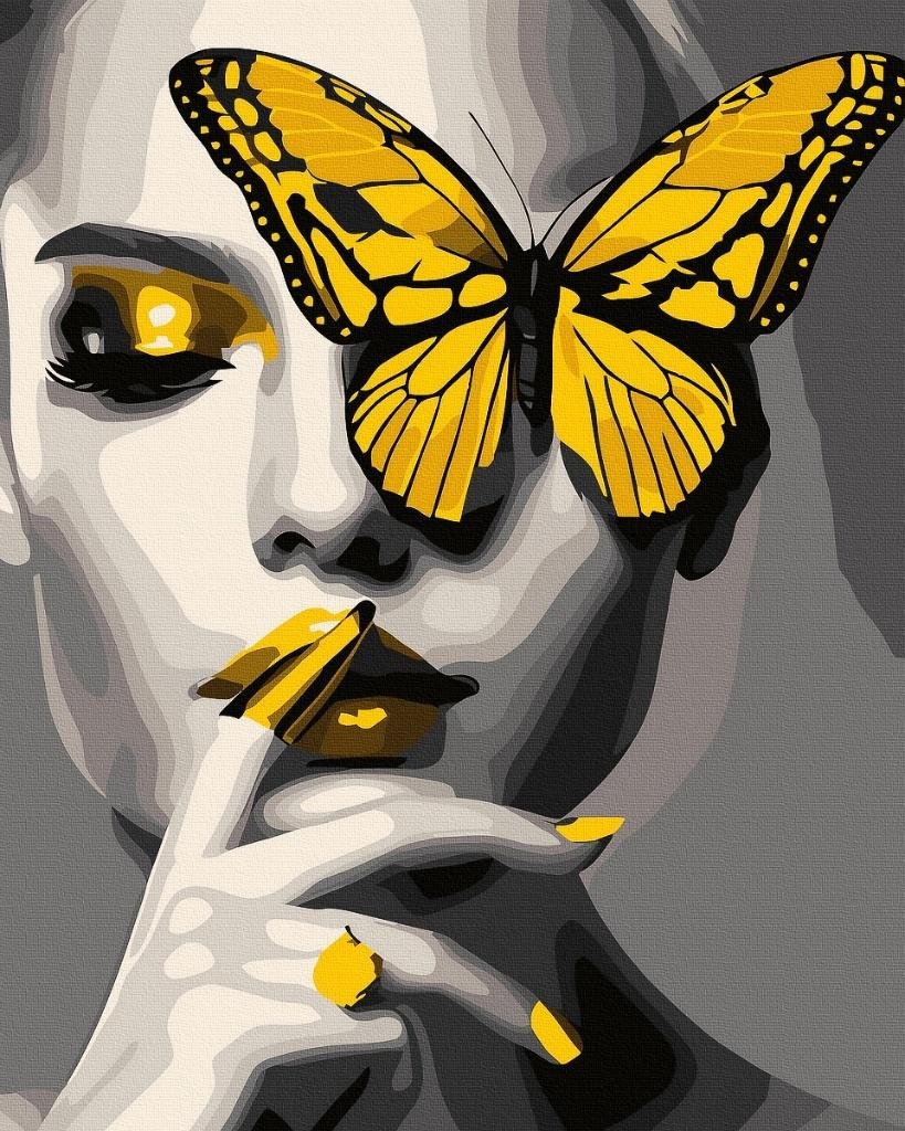 Przenieś się do świata zmysłowej elegancji i subtelnego kontrastu dzięki tej wyjątkowej kompozycji. Obraz przedstawia tajemniczą kobietę w odcieniach szarości, której twarz zdobi intensywnie żółty motyl. Złote akcenty na ustach, paznokciach i pierścionku przyciągają wzrok i dodają całości nowoczesnego, modowego charakteru.
