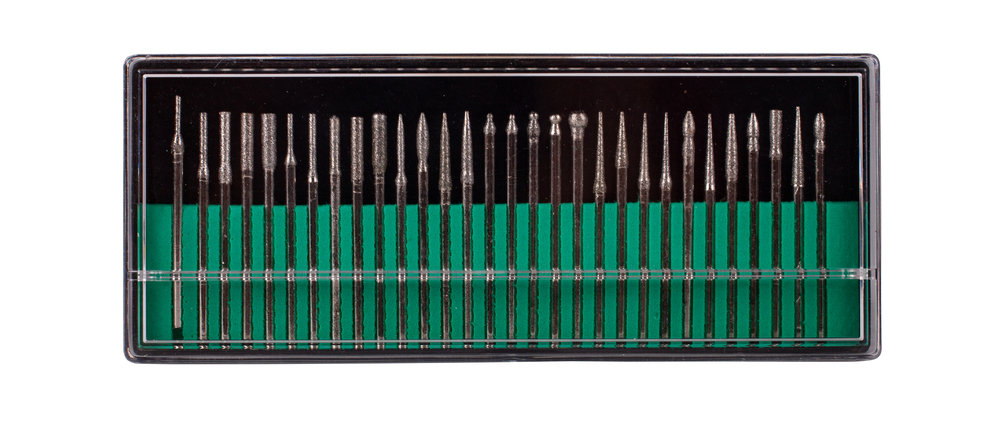 36 frezów diamentowych + 6 cylinderków ściernych + 12 frezów kamiennych - doskonale trzymają się nośnika, wykonanie zabiegu przy ich użyciu jest skuteczne, bezpieczne i precyzyjne.