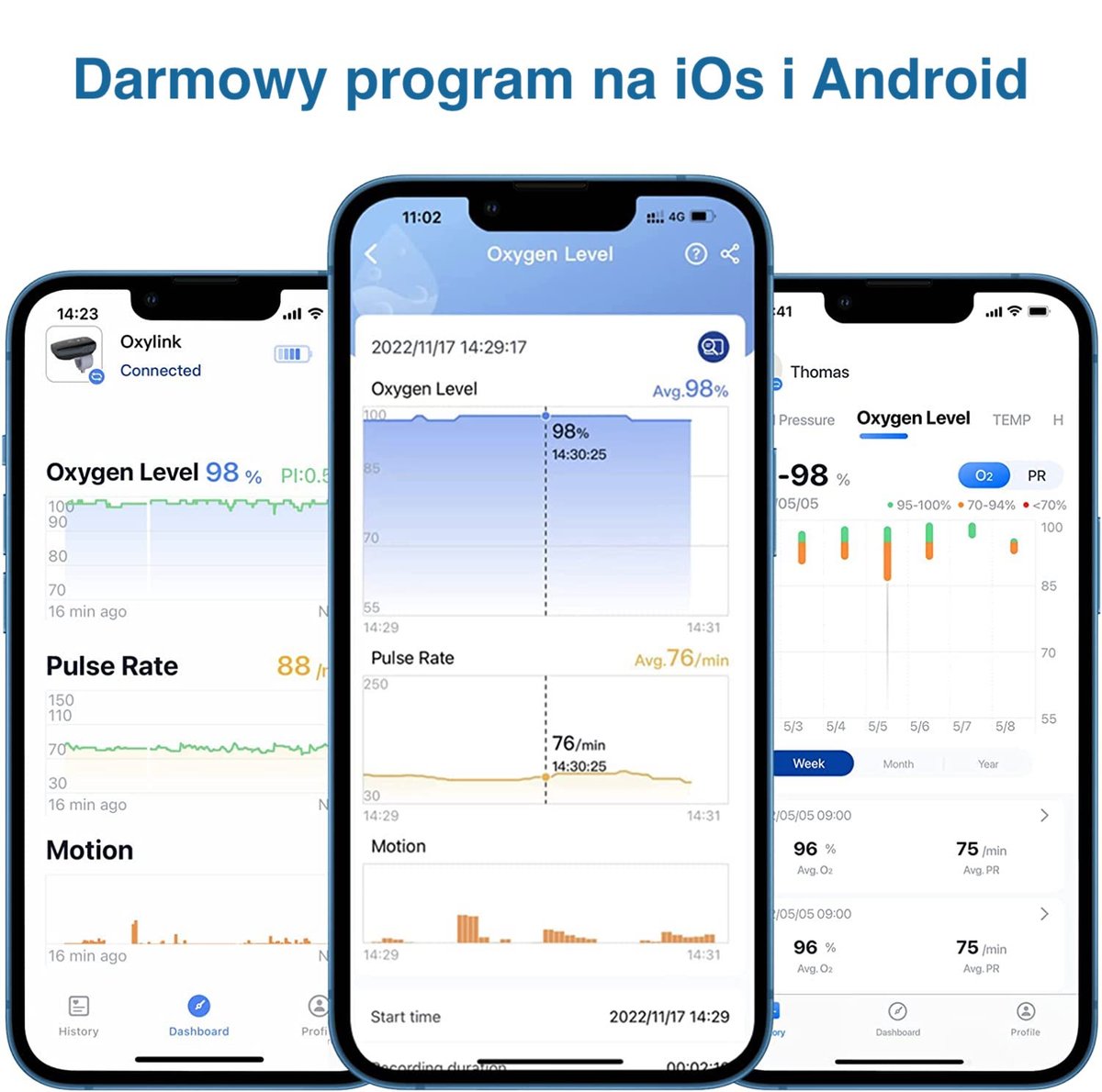 Oxylink™ to pulsoksymetr który stale monitoruje poziom tlenu we krwi i alarmuje o bezdechu. Zapewnia dogłębną analizę w nocy dzięki monitorowaniu tlenu i tętna. Wyniki w łatwy sposób sprawdzisz na smartfonie lub komputerze poprzez darmowe aplikacje.