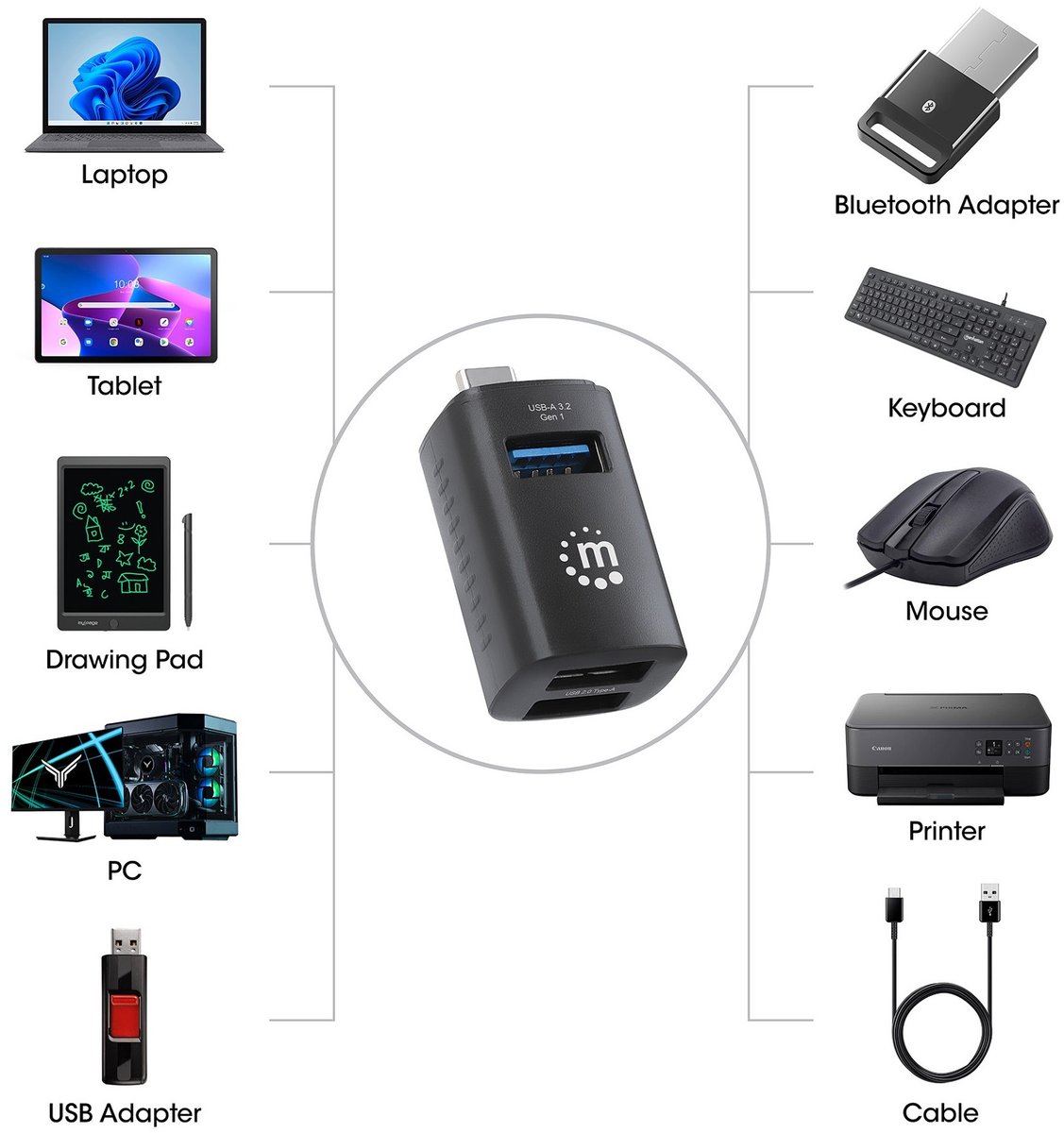 Hub USB Manhattan 180993 – Rozdzielacz 3-Portowy Hub USB 3.2 Gen1 Typ-C na 1x USB-A 3.0, 2x USB-A 2.0