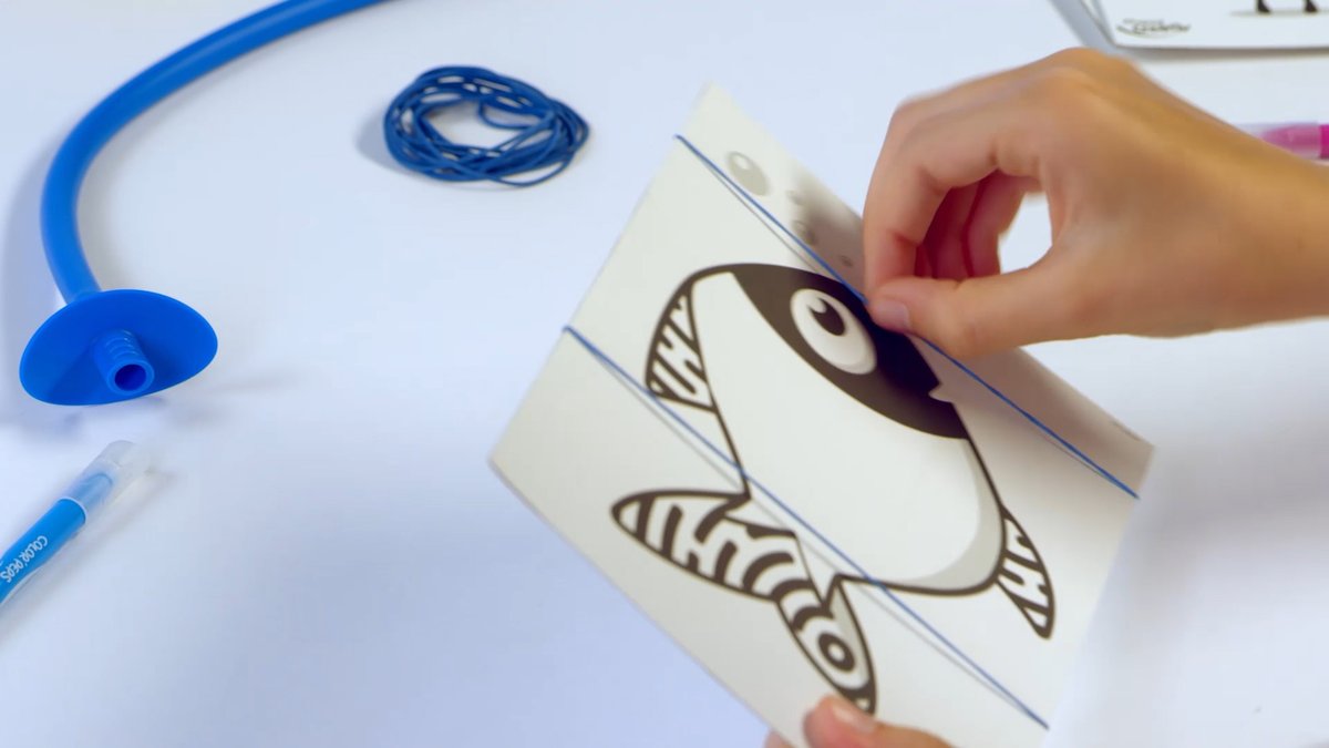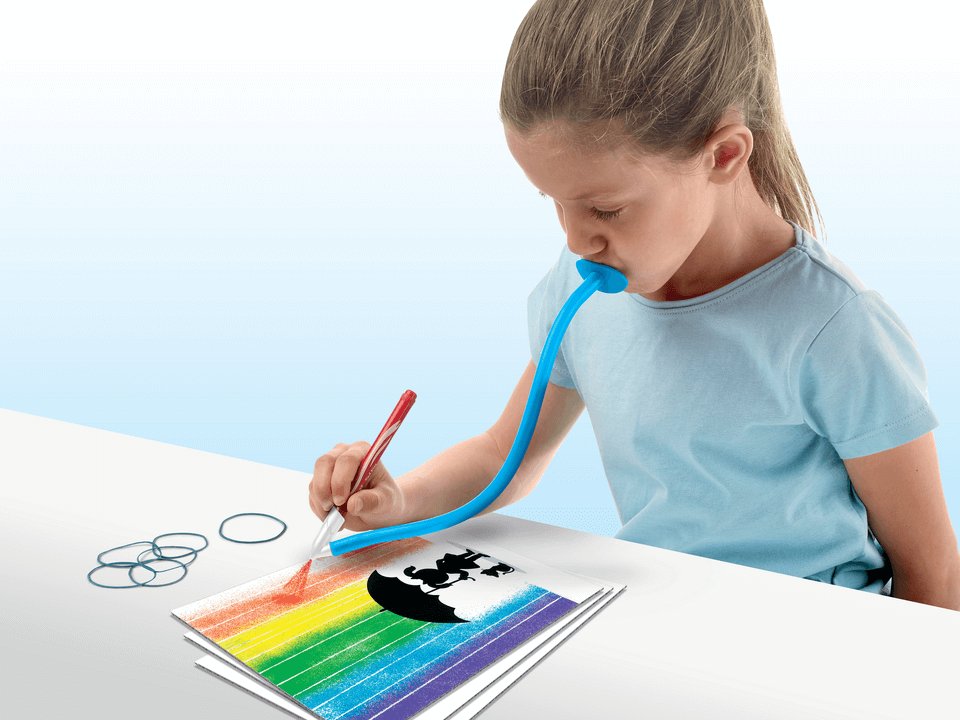 Nietypowy sposób na kolorowanie - umieść flamaster w plastikowej nasadce z elastyczną rurką i dmuchaj w ustnik a kolorowa mgiełka osiądzie na kartce dając ciekawy efekt. W ogóle się nie zmęczysz - dzięki rurce nie musisz się schylać nad swoim arcydziełem. Mamy dla Ciebie extra pomysł na ciekawy efekt - owiń gumkami swoją pracę przed malowaniem i ściagnij je na sam koniec- zaskoczony?
