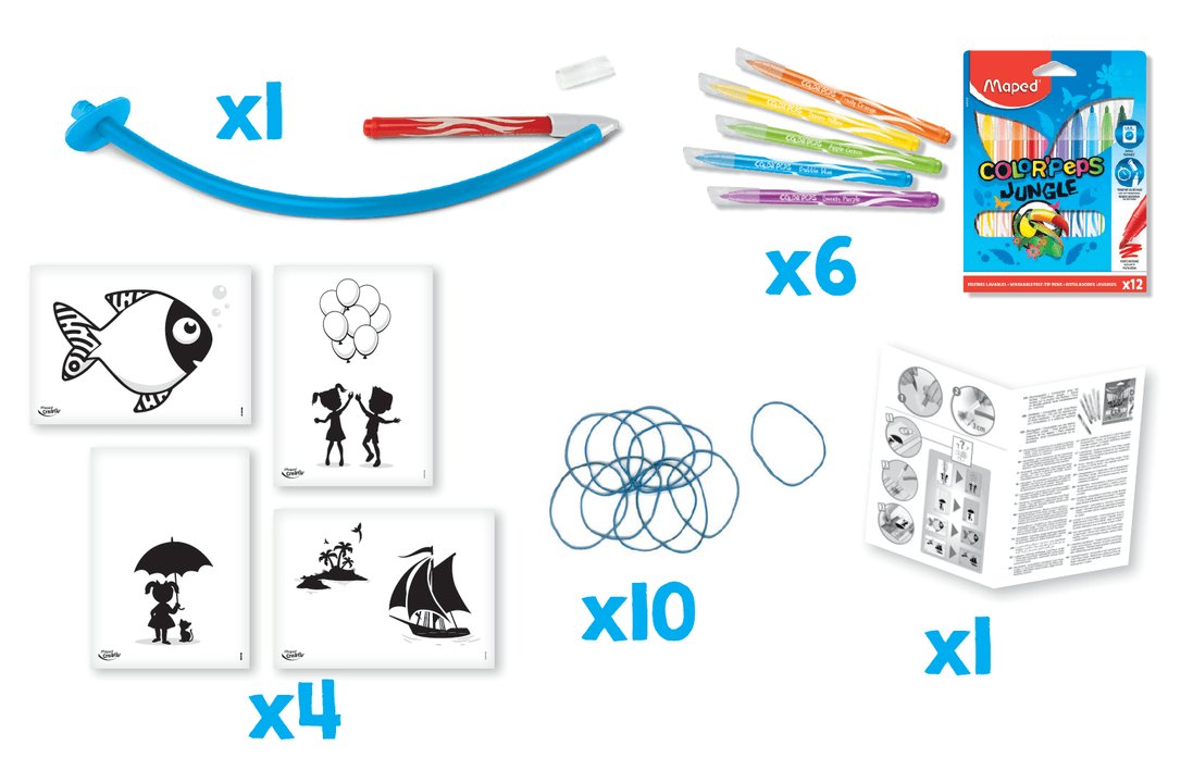 Zestaw zawiera: 1 plastikową rurkę z nasadką na flamaster i ustnikiem z drugiej strony, 6 flamastrów Jungle, 4 karty z nadrukiem do kolorowania, 10 gumek recepturek. JS 1 szt