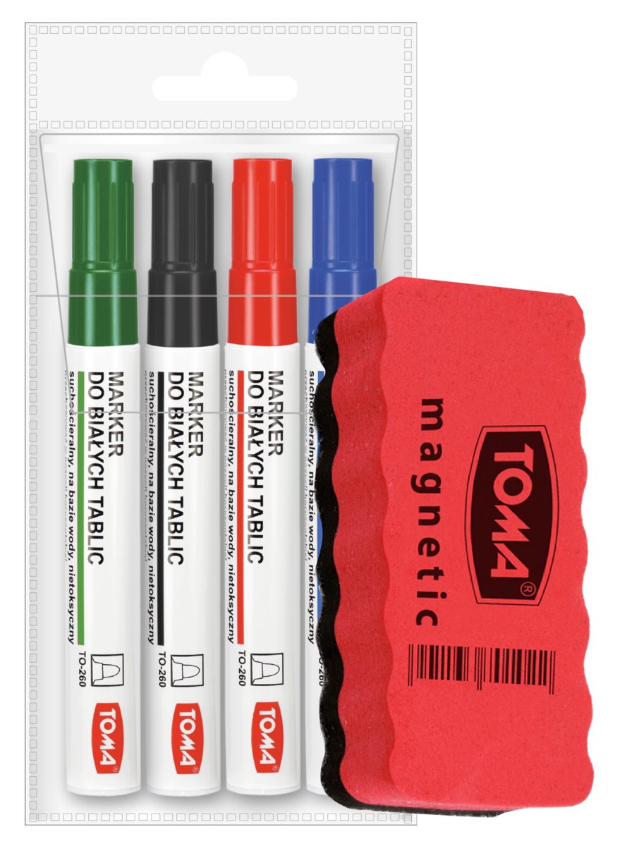 260 markery do białych tablic - markery do pisania po tablicach suchościeralnych, łatwościeralny tusz proszkowy na bazie alkoholu, zapach neutralny, końcówka okrągła 2 mm, 4 kolory tuszu: czarny, niebieski, czerwony, zielony