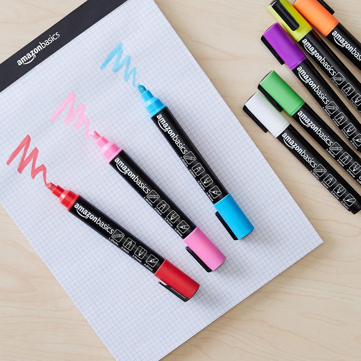 Zestaw 8 sztuk wysokiej jakości markerów kredowych Amazon Basics, przeznaczonych do pisania po gładkich powierzchniach: tablicach, szkle, plastiku, lustrach czy metalach. Idealne do zastosowań w domu, szkole, restauracjach i biurach – do menu, notatek, prezentacji lub zabawy.