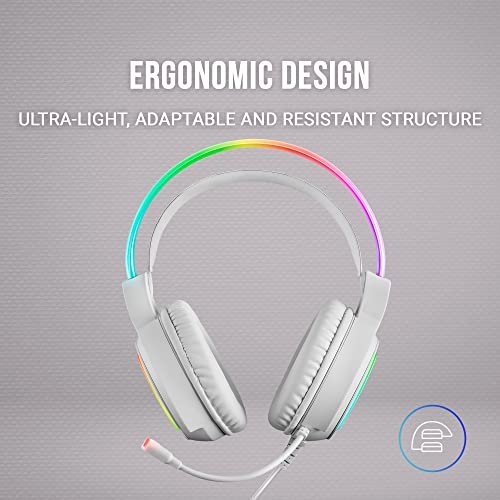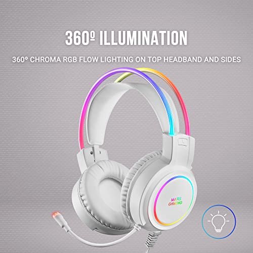 Mars Gaming MHRGB White, słuchawki Chroma RGB Flow, profesjonalny mikrofon, dźwięk przestrzenny OŚWIETLENIE CHROMA 360°: Spektakularny system oświetlenia CHROMA RGB Flow 360°, który synchronicznie oświetla górny pałąk i boki. PRZETWORNIKI HI-FI ULTRA-BASS 3D: MHRGB odtwarzają dźwięk w profesjonalny sposób jakość, która w pełni wciągnie Cię w każdą grę, a także wzmocni basy i przestrzenność, aby zapewnić doskonałe wrażenia BARDZO LEKKA, ERGONOMICZNA KONSTRUKCJA: Struktura MHRGB jest ultralekka, łatwa do dostosowania i odporna; Podkładki z pianki zapamiętującej kształt i bardzo duży rozmiar pozwalają na maksymalną redukcję ciśnienia. PROFESJONALNA KOMUNIKACJA: Elastyczny mikrofon zapewnia czysty i wyraźny dźwięk podczas komunikacji z członkami drużyny w grach online dzięki filtrowaniu szumów i kapsułce szumowej. wysoka jakość CAŁKOWITA KOMPATYBILNOŚĆ: Uniwersalna łączność dzięki pojedynczym i podwójnym złączom jack oraz w pełni kompatybilna z Windows, PS4, PS5, XBOX ONE, XBOX SERIES XS, Mac, Nintendo Switch, smartfonem i tabletem