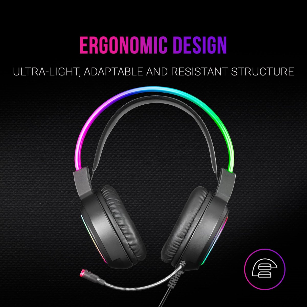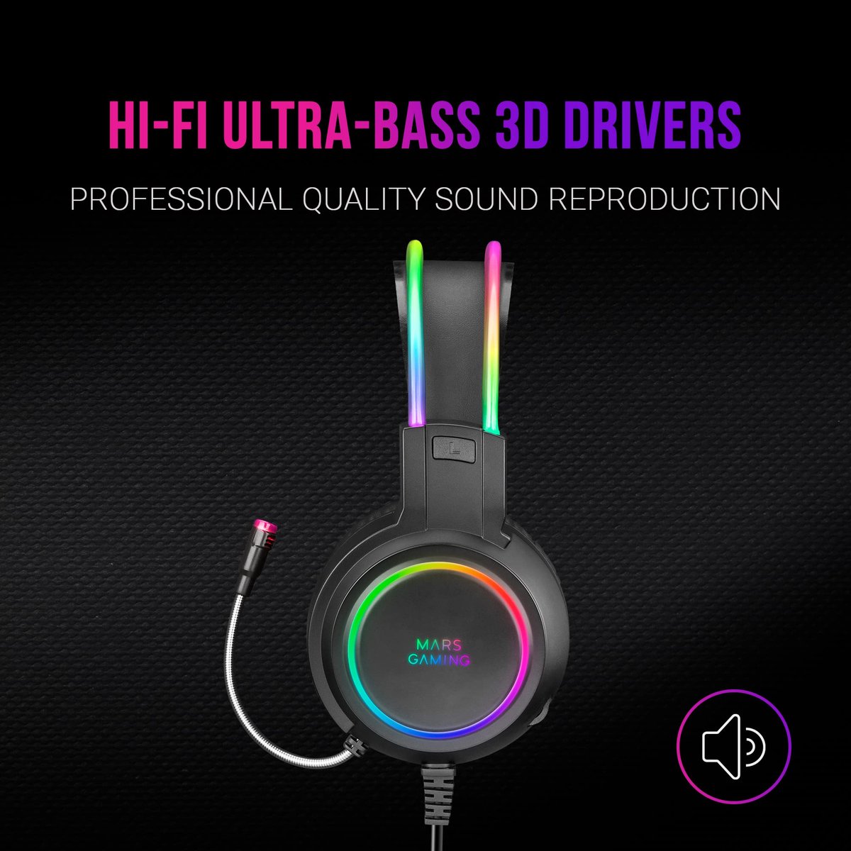 Mars Gaming MHRGB Black, słuchawki Chroma RGB Flow, profesjonalny mikrofon, dźwięk przestrzenny OŚWIETLENIE CHROMA 360°: Spektakularny system oświetlenia CHROMA RGB Flow 360°, który synchronicznie oświetla górny pałąk i boki. PRZETWORNIKI HI-FI ULTRA-BASS 3D: MHRGB odtwarzają dźwięk w profesjonalny sposób jakość, która w pełni wciągnie Cię w każdą grę, a także wzmocni basy i przestrzenność, aby zapewnić doskonałe wrażenia BARDZO LEKKA, ERGONOMICZNA KONSTRUKCJA: Struktura MHRGB jest ultralekka, łatwa do dostosowania i odporna; Podkładki z pianki zapamiętującej kształt i bardzo duży rozmiar pozwalają na maksymalną redukcję ciśnienia. PROFESJONALNA KOMUNIKACJA: Elastyczny mikrofon zapewnia czysty i wyraźny dźwięk podczas komunikacji z członkami drużyny w grach online dzięki filtrowaniu szumów i kapsułce szumowej. wysoka jakość CAŁKOWITA KOMPATYBILNOŚĆ: Uniwersalna łączność dzięki pojedynczym i podwójnym złączom jack oraz w pełni kompatybilna z Windows, PS4, PS5, XBOX ONE, XBOX SERIES XS, Mac, Nintendo Switch, smartfonem i tabletem