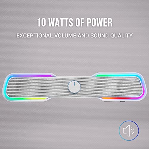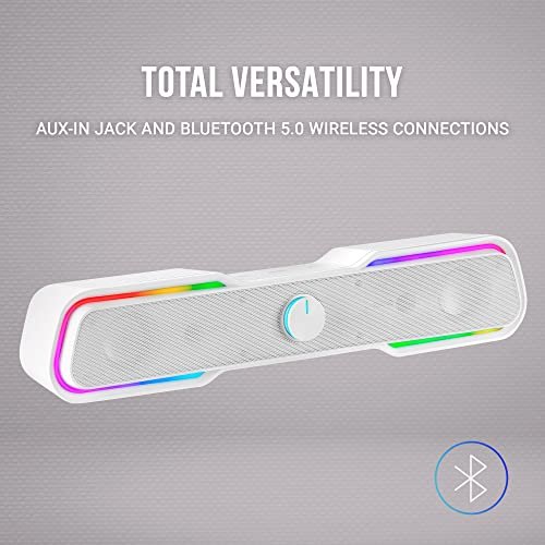 MARSGAMING MSBXW Biały, listwa dźwiękowa RGB, Bluetooth 5.0 + Jack 3.5, dźwięk DSP 10 W @ @ MOC 10 W: Ciesz się pełną głośnością i doskonałą jakością dźwięku podczas grania w gry, oglądania filmów, seriali lub słuchania muzyki; A wszystko to dzięki wygodnemu zasilaniu przez