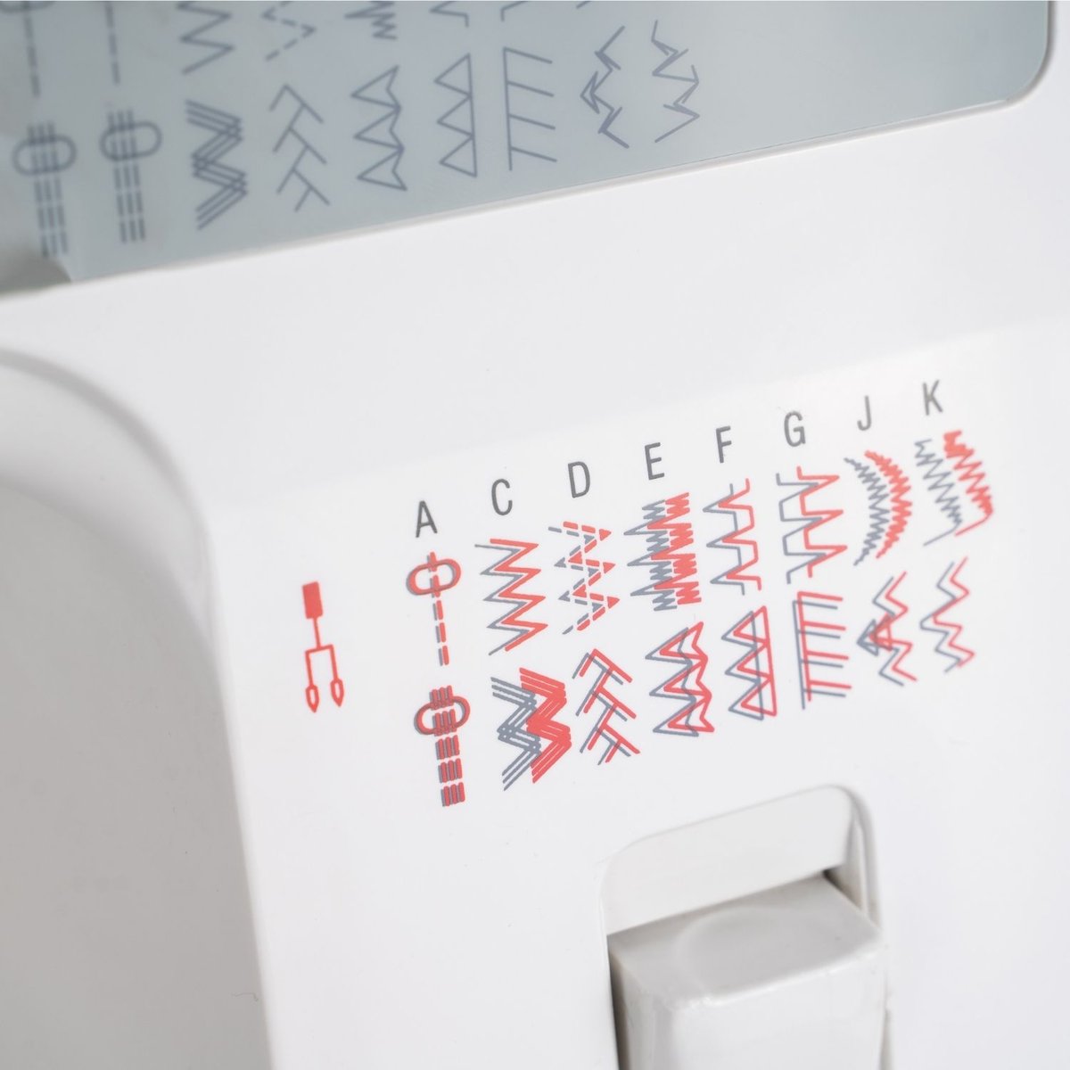 Na głównym pokrętle maszyny ustawić można 22 różne programy. Jeśli zamontujemy podwójną igłę (znajdującą się w zestawie), całkowita ilość wzorów możliwych do wyszycia to aż 38! Ściegi podwójne (mocne i elastyczne) zostały zilustrowane na korpusie maszyny kolorem czerwonym.
