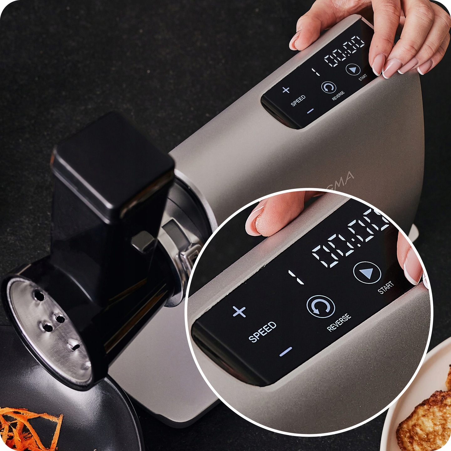 6-stopniowa regulacja prędkości pozwala idealnie dopasować tempo mielenia do rodzaju mięsa, gwarantując doskonałe rezultaty. Maszynka pracuje efektywnie i precyzyjnie niezależnie od konsystencji i ilości składników.
