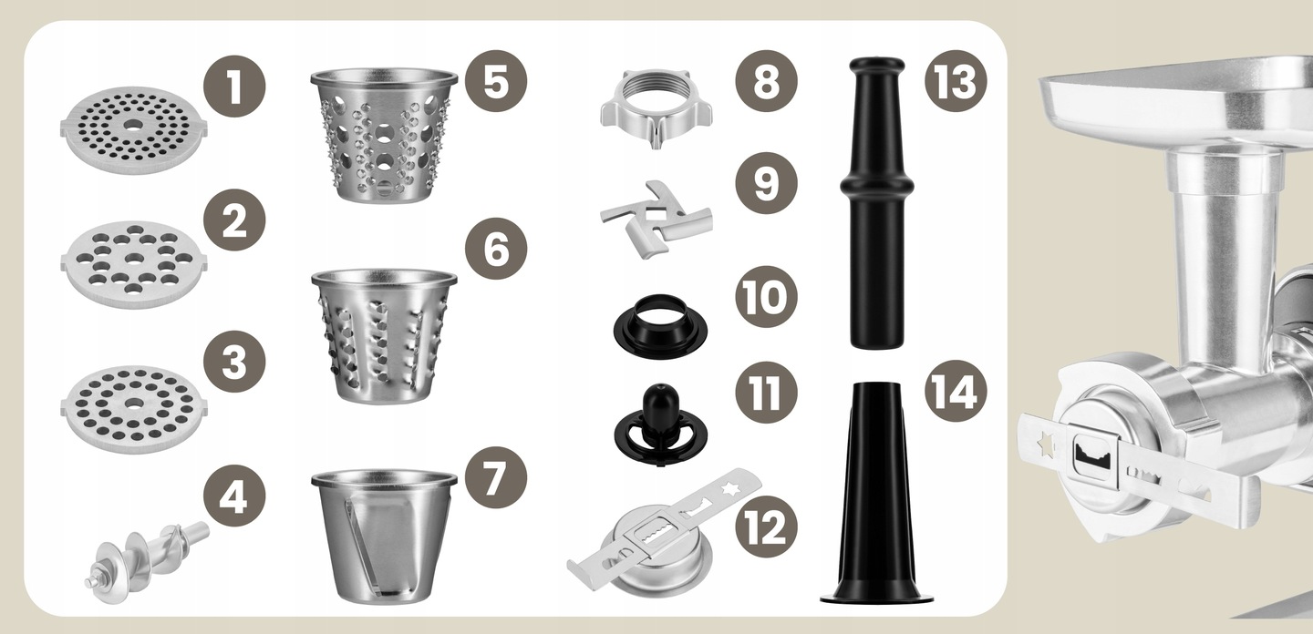 Wyjątkowo mocny silnik o mocy szczytowej 2500 W zapewnia błyskawiczne i efektywne mielenie mięsa nawet w dużych ilościach. Urządzenie sprawdzi się zarówno na co dzień, jak i podczas intensywnego użytkowania.