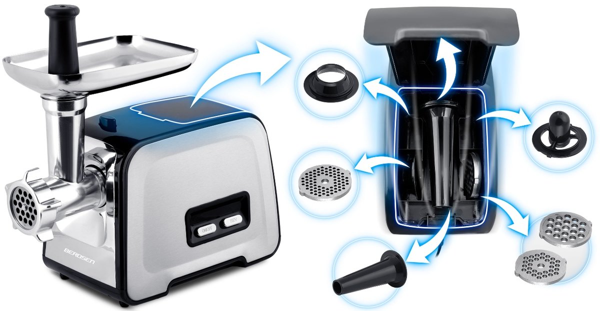 Profesjonalna maszynka elektryczna do mielenia mięsa Berdsen 450 W / 1200 W 3 sitka / tuleja masarska / przystawka kebbe/ 4 nasadki Berdsen: BM-601B Nowoczesna maszynka do mielenia ...