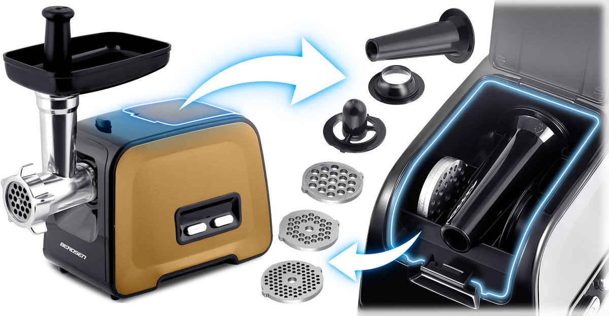 Wszystkie elementy maszynki Berdsen są najwyższej jakości. Mocny silnik, metalowy ślimak oraz wytrzymałe przekładnie sprawią, że będziesz bezproblemowo używać produktu przez wiele lat. Dzięki kompaktowym rozmiarom oraz ze schowkiem na akcesoria przechowywanie nie będzie sprawiać problemów.
